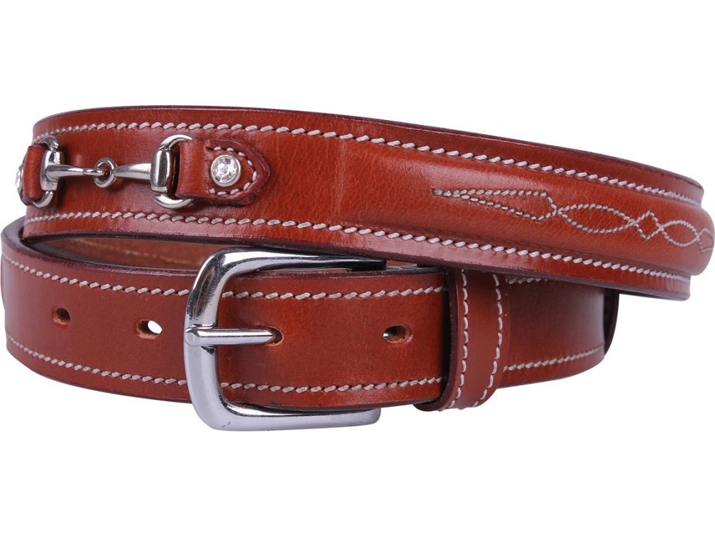 Skórzany pasek z eleganckimi białymi przeszyciami. Ozdobiony metalowym wędzidłem i dżetami. Dostępne również w kolorze czarnym.