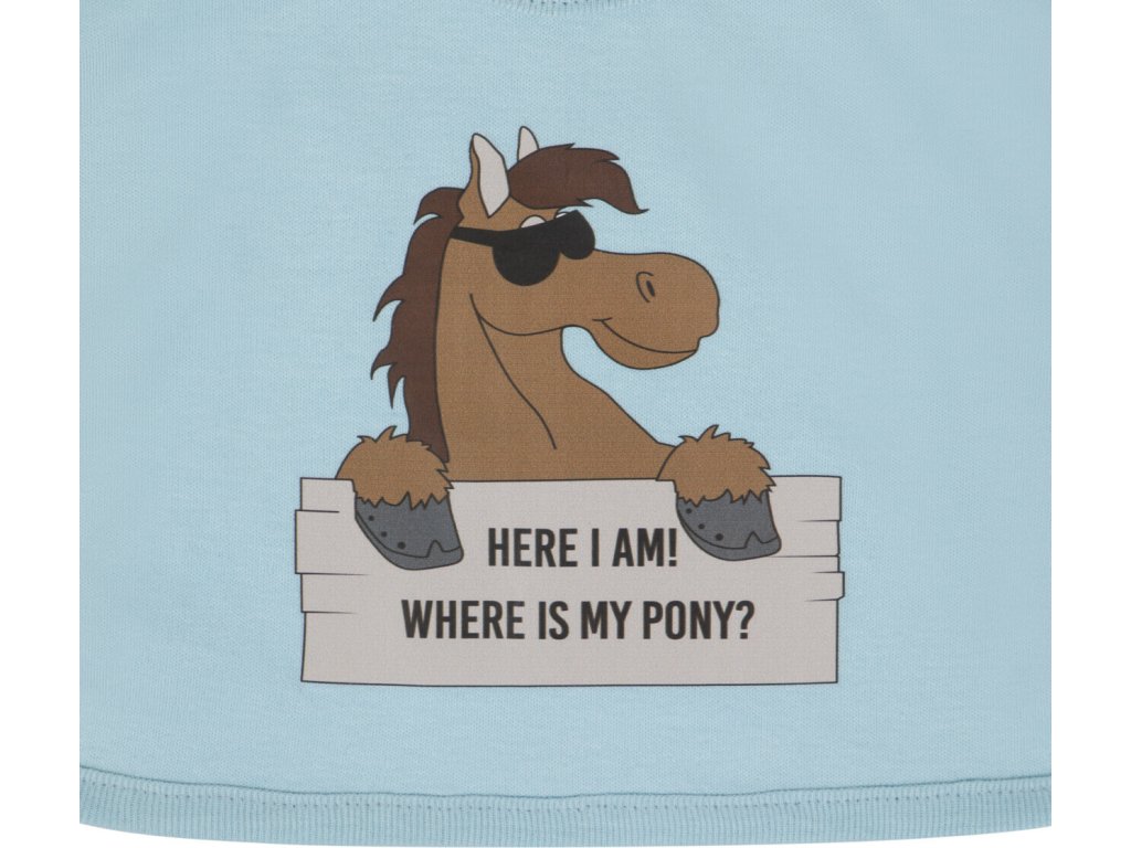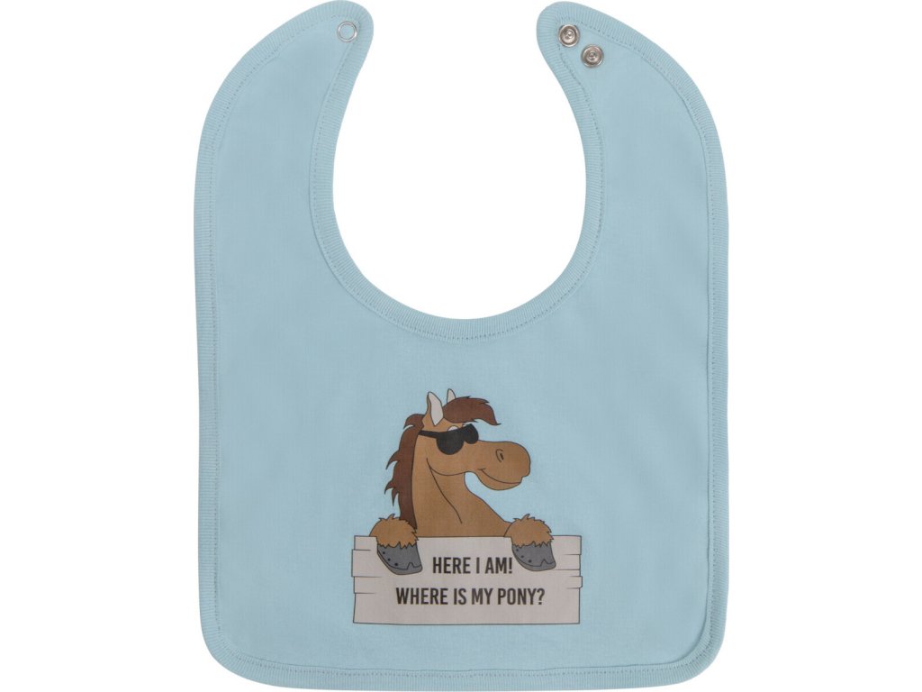 Uroczy śliniak z zabawnym tekstem i motywem konia. Zapinany na zatrzaski. Śliniak wykonany jest z przyjemnego w dotyku materiału bawełnianego.