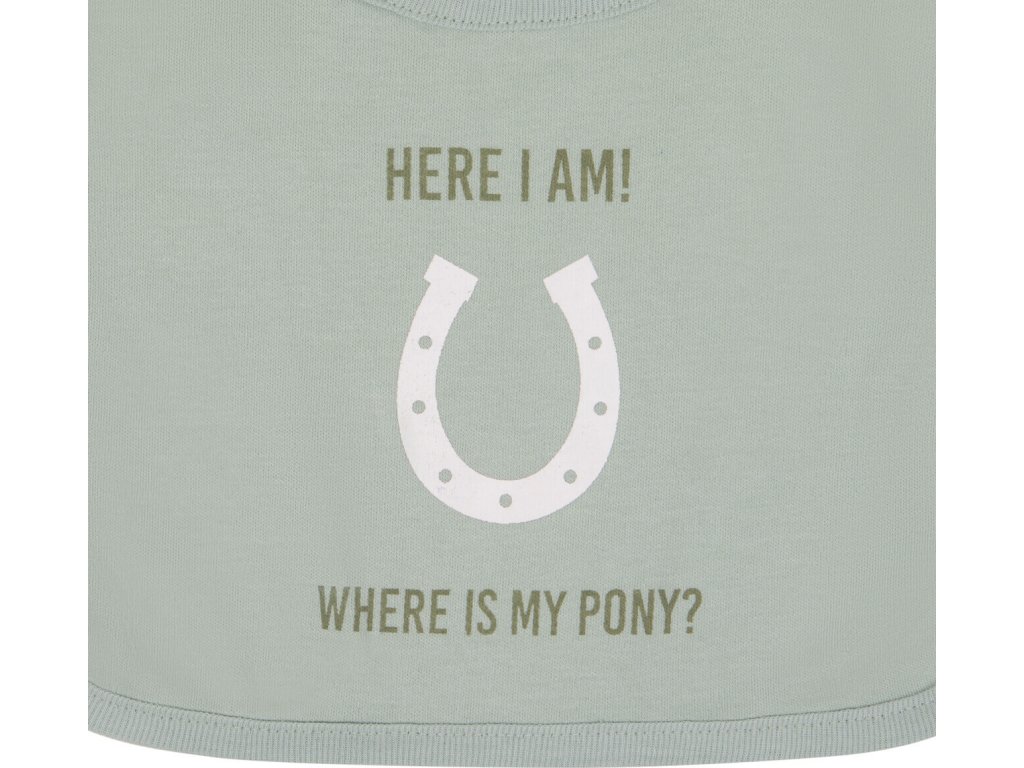Uroczy śliniak ze śmiesznym tekstem i motywem podkowy. Zapinany na zatrzaski. Śliniak wykonany jest z przyjemnego w dotyku materiału bawełnianego.