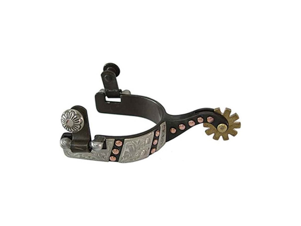 Wysokiej jakości ostrogi westernowe wykonane z żelaza. Zdobione srebrnymi ozdobami i mosiężnymi kropkami. Wyposażone w gwiazdkę ostrogi. Dostarczane w parze.