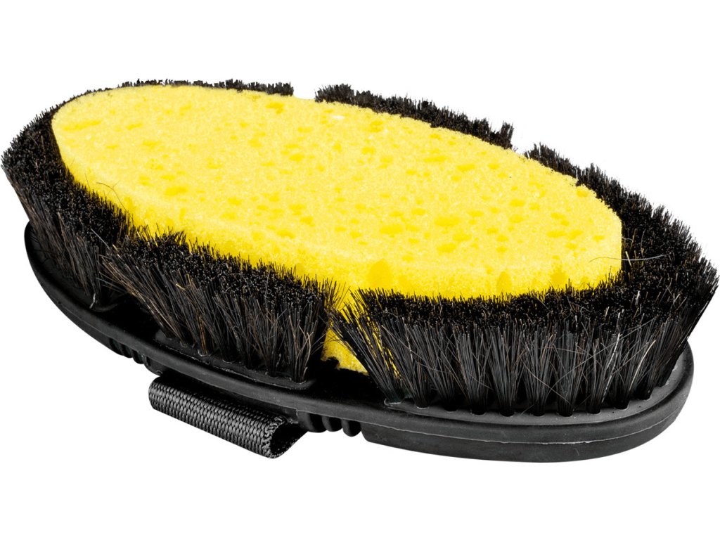 Szczotka do ciała z gąbką. Idealna do mycia konia. Wyposażona w nylonowy uchwyt zapewniający wygodny chwyt. Szczotka idealnie dopasowuje się do dłoni dzięki wygięciom.