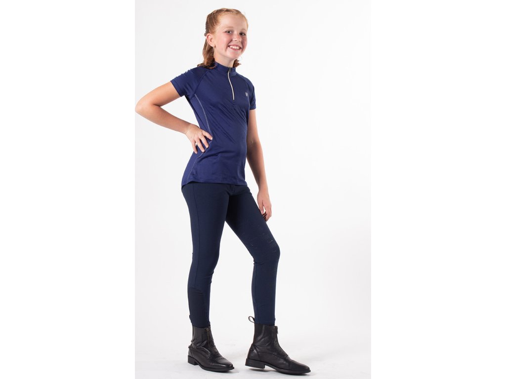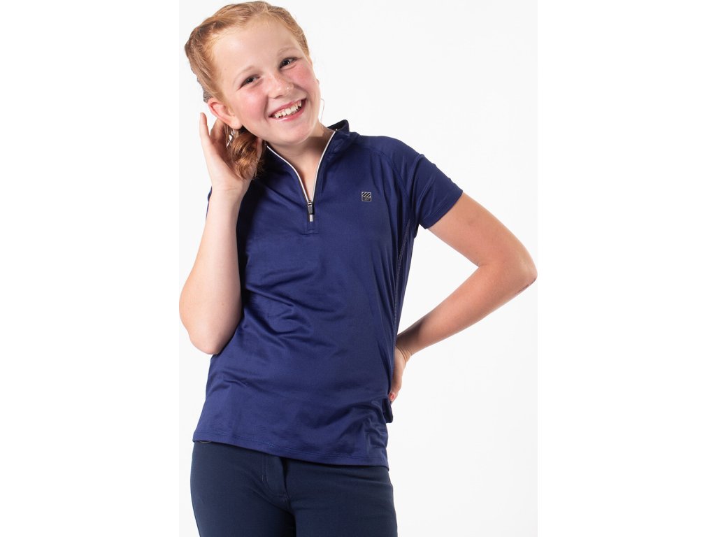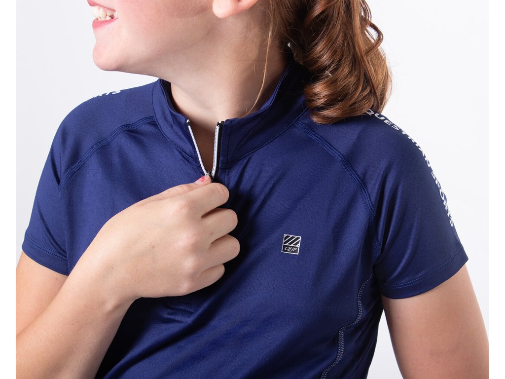 Koszulka sportowa dla dzieci z krótkim rękawem. Specjalny nadruk po wewnętrznej stronie zatrzymuje ciepło ciała. Szwy są wyposażone w odblaskową wstawkę, jak również przedni zamek błyskawiczny. Ozdobiona napisem "Equestrian Sports" na ramionach i małym logo QHP na piersi.