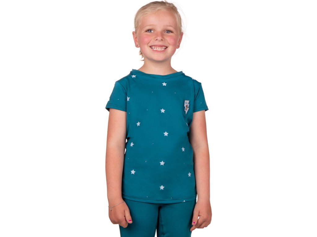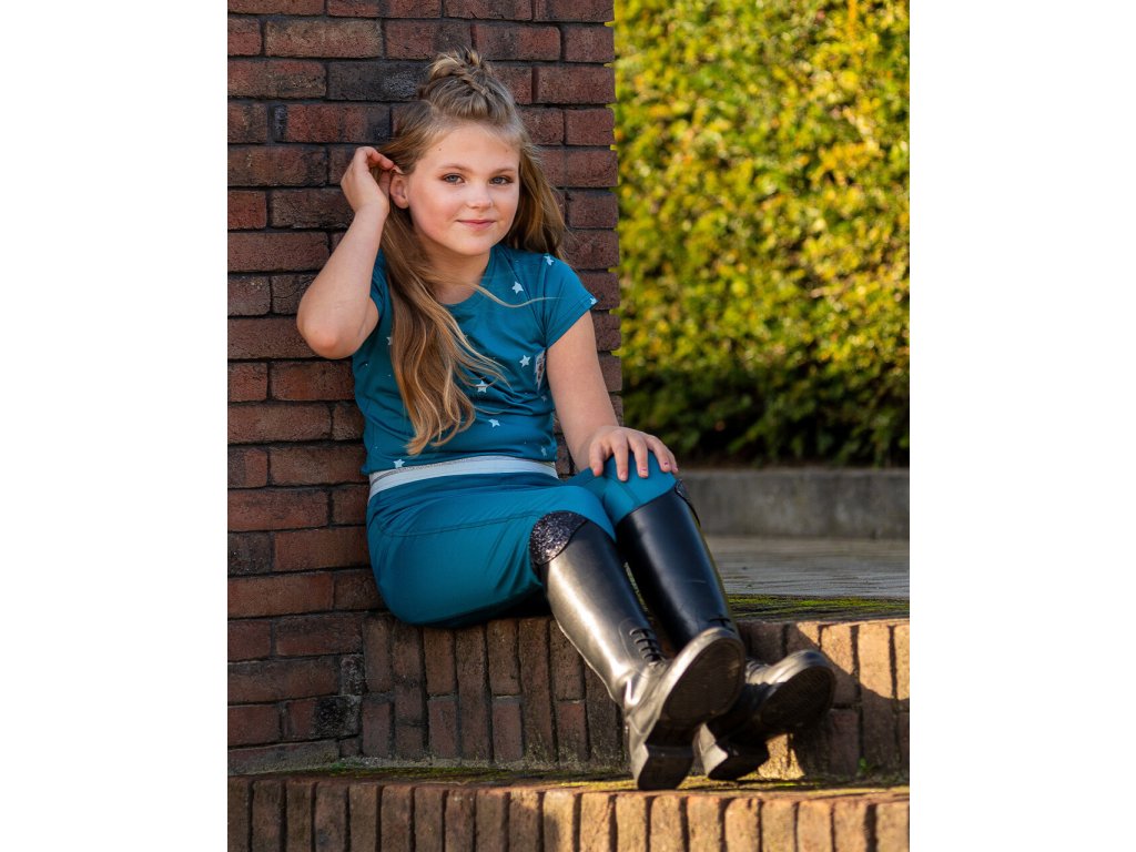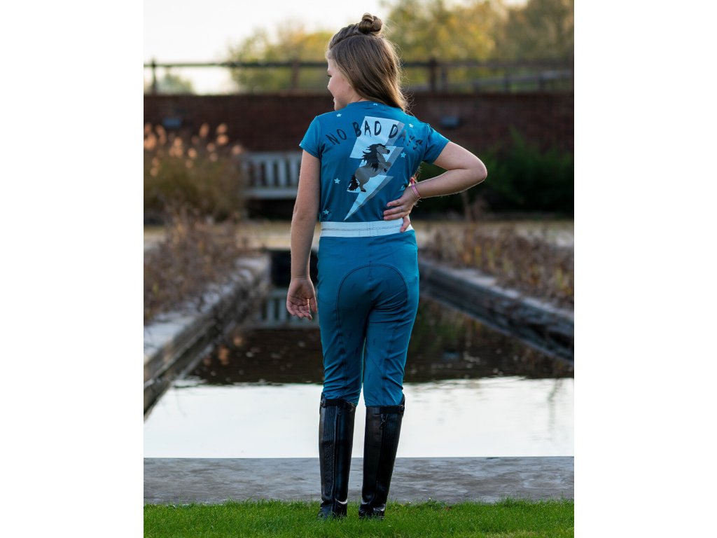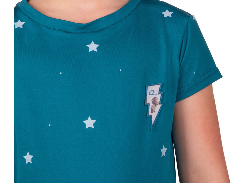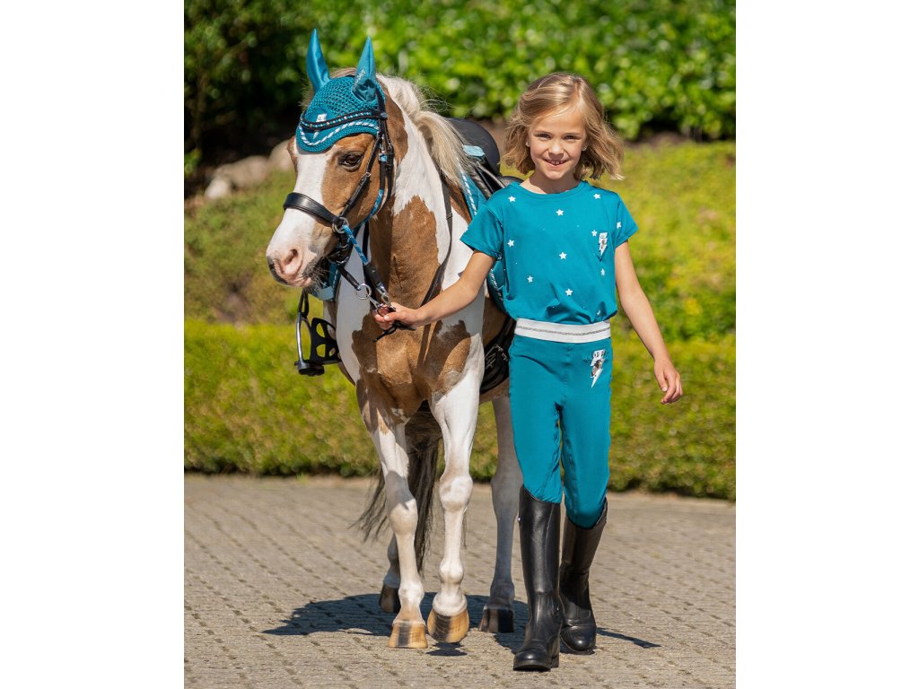 Urocza koszulka jeździecka dla dzieci. Wykonana jest z bardzo wygodnego materiału, który jest elastyczny i szybkoschnący. Ozdobiona jest nadrukiem w gwiazdy i piorunem na plecach, który jest charakterystyczny dla tej uroczej kolekcji. Czaprak idealnie pasuje do innych produktów z kolekcji Thunderbolt QHP.