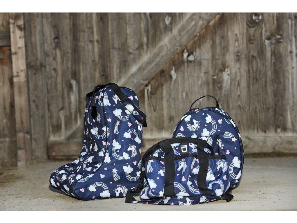 Dziecięca torba zamykana do czyszczenia z regulowanym i odpinanym paskiem na ramię. Posiada 6 kieszeni zewnętrznych, małą wewnętrzną kieszeń na suwak i dużą wewnętrzną komorę, którą można łatwo zamknąć za pomocą ściągacza. Torba jest ozdobiona nadrukiem serc, tęczy i jednorożców w radosnych kolorach. Czarno-białe gumowe firmowe logo na przedniej kieszeni. Torba wykonana jest z wytrzymałego poliestru 600D i posiada plastikowe nóżki na spodzie zapobiegające zabrudzeniu. Torba jest częścią kolekcji dziecięcej o tym samym wzorze.