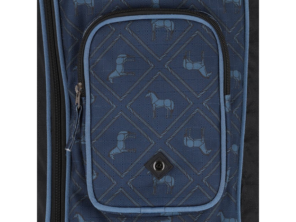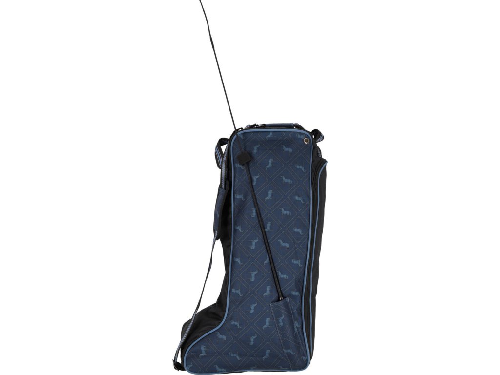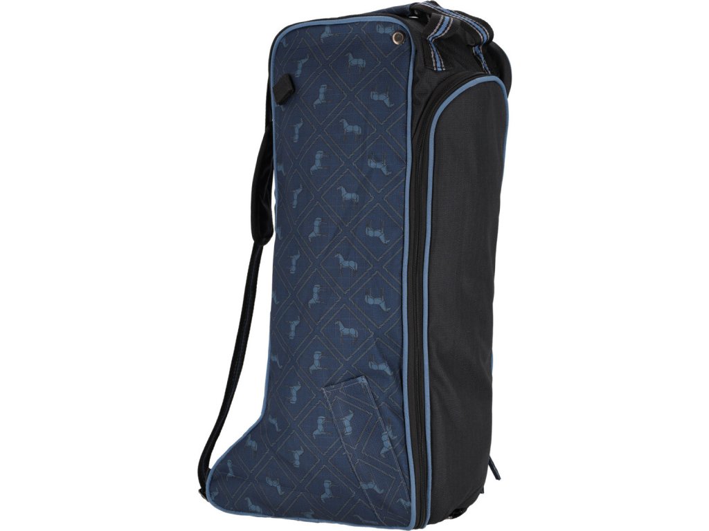 Wysokiej jakości torba na wysokie buty jeździeckie, zapewniająca doskonałą ochronę przed brudem i uszkodzeniami. Wykonana jest z materiału wodoodpornego z małymi otworami wentylacyjnymi, które odprowadzają wilgoć. Posiada również małą kieszeń na drobiazgi i dużą kieszeń na buty. Kieszeń na buty ma wewnątrz przegrodę, która zapobiega ocieraniu się butów o siebie. Obie kieszenie zapinane są na zamek błyskawiczny. Torba posiada również kieszeń na identyfikator, dwa uchwyty i odpinany pasek na ramię z miękką wyściółką.