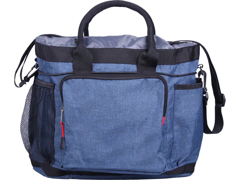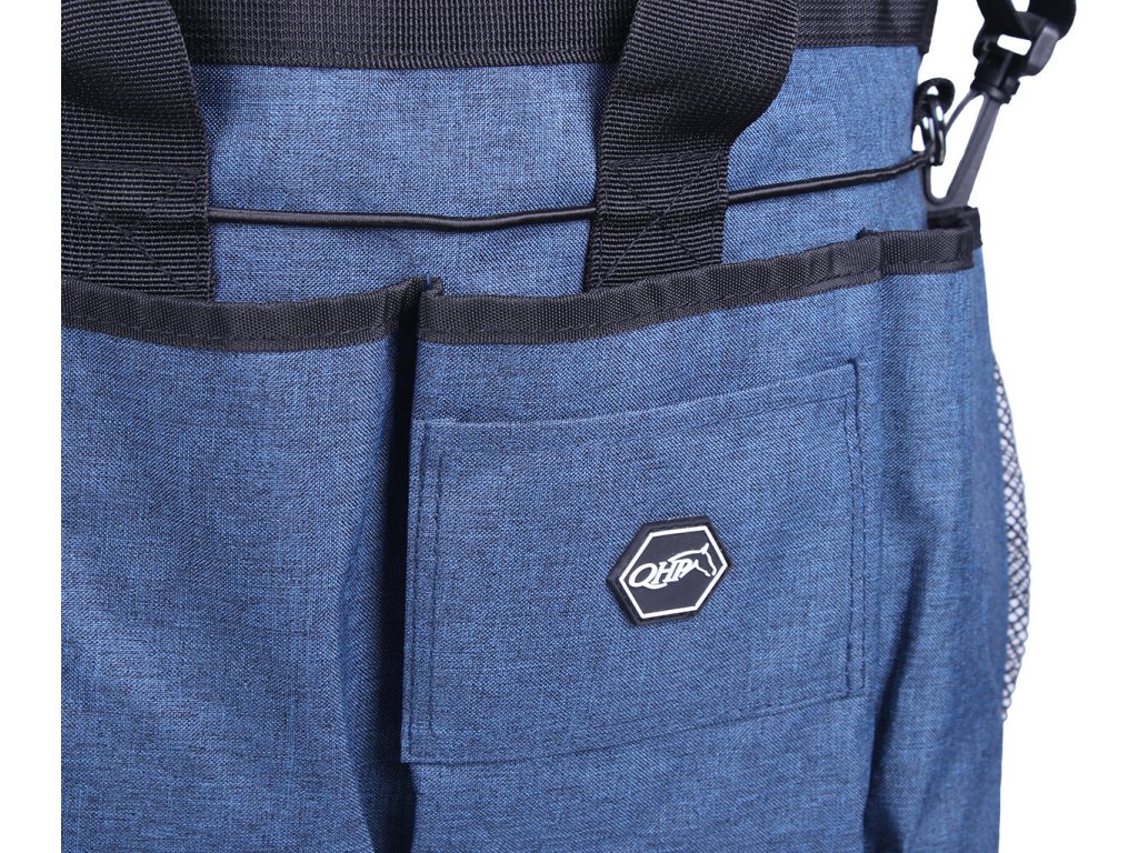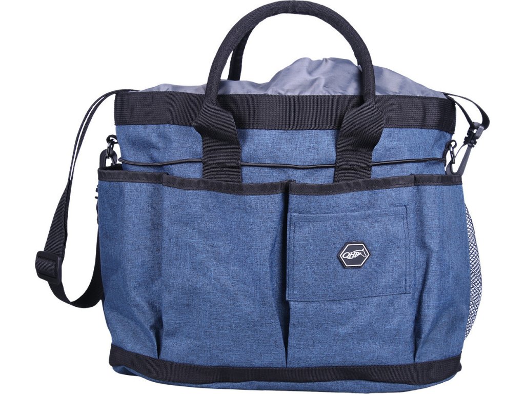 Luksusowa torba do pielęgnacji, z dużą przestrzenią do przechowywania. Wykonana z materiału, który odpycha wodę. Torba jest wyposażona w miękki, odpinany pasek na ramię i krótsze paski. Posiada dużą kieszeń ze ściągaczem i kieszeń zapinaną na zamek wewnątrz. Mniejsze kieszenie zewnętrzne idealnie nadają się do przechowywania szczotek, a siateczkowa kieszeń na napoje. Na spodzie znajdują się plastikowe nóżki zapewniające lepszą stabilność. Torba jest ozdobiona logo QHP. Dostępna w kilku kolorach.