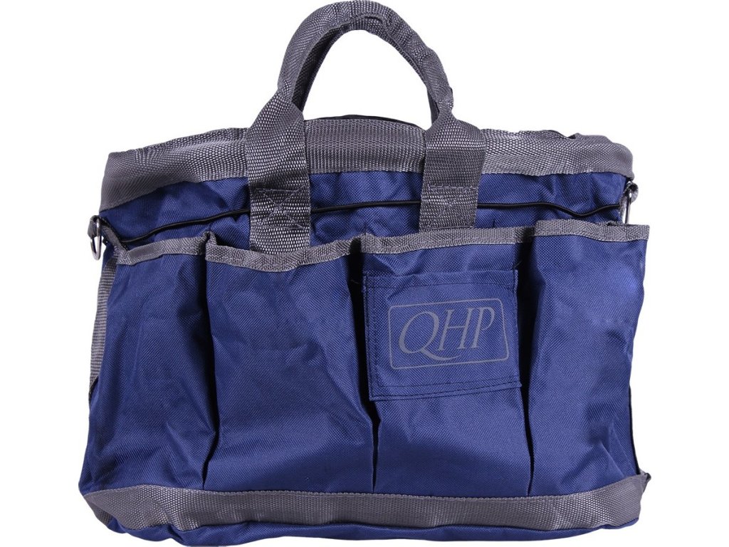Praktyczna, zamykana torba do pielęgnacji koni z odpinanym paskiem na ramię, kieszeniami zewnętrznymi i wewnętrznymi, haftowane logo QHP. Dostępne w wielu kolorach.