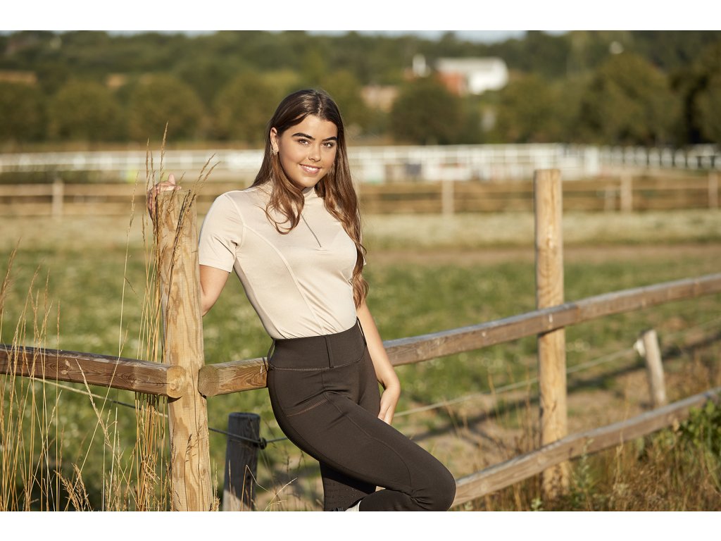 Funkcjonalna koszulka jeździecka z krótkimi rękawami i stójką oraz zamkiem na pół wykonana z wygodnego, elastycznego poliestru. Materiał zapewnia efekt chłodzenia i odprowadza wilgoć od ciała, dzięki czemu zawsze pozostajesz suchy. Koszulka jest idealna do treningu w gorące dni. Dostępna w wielu wariantach kolorystycznych i rozmiarach.