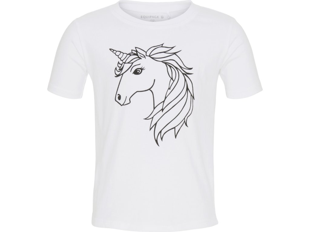 Uroczy bawełniany T-shirt dziecięcy z krótkim rękawem i nadrukiem jednorożca. Dostarczany z czterema pisakami do tkanin, dzięki czemu możesz samodzielnie pokolorować jednorożca. Idealna wskazówka na prezent dla małego jeźdźca. Dostępna w wielu rozmiarach.