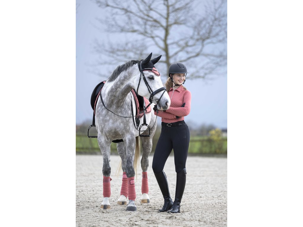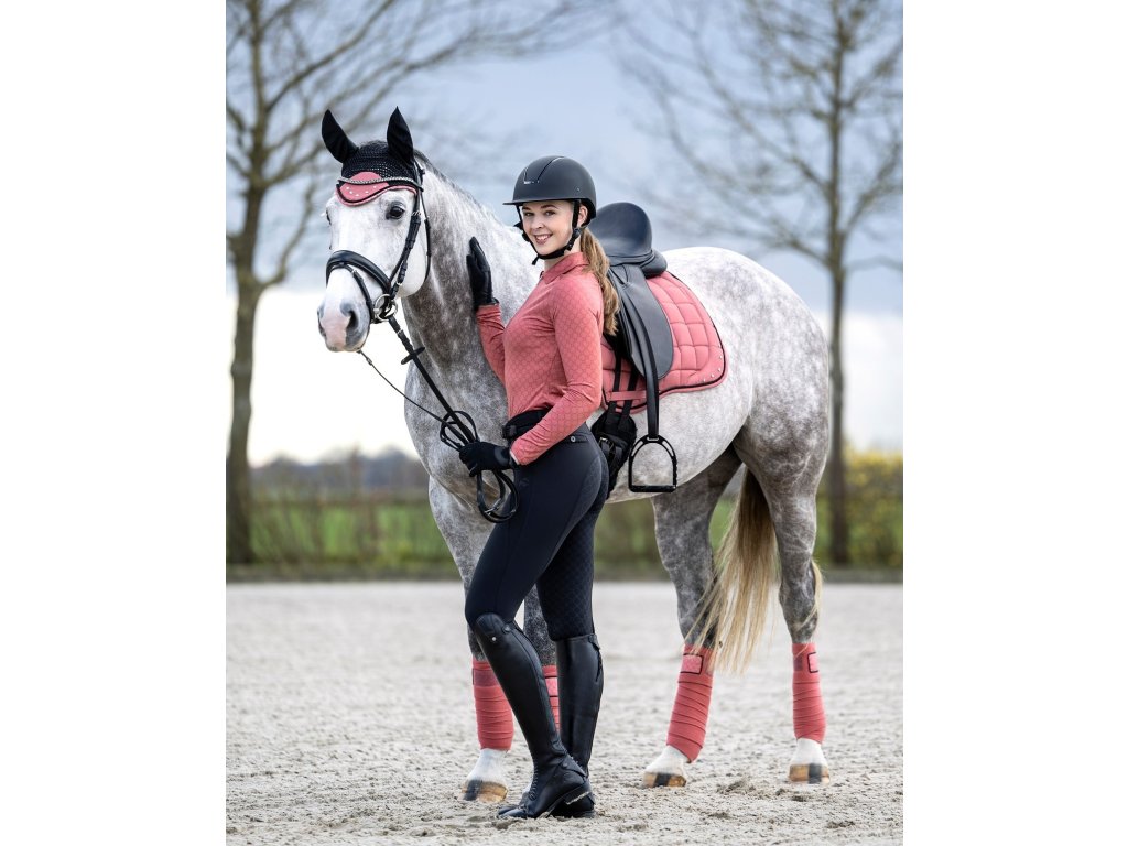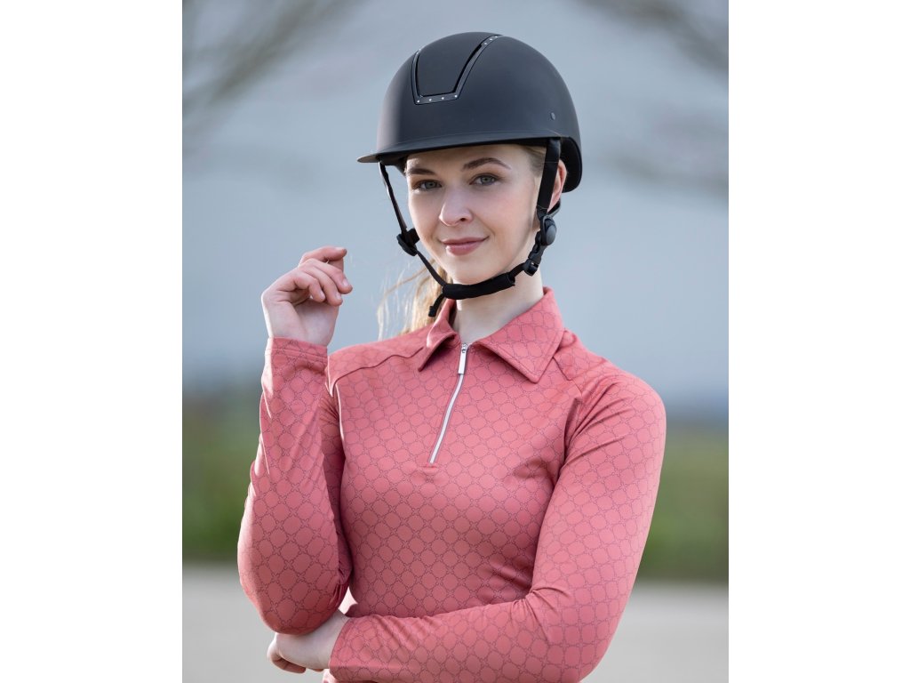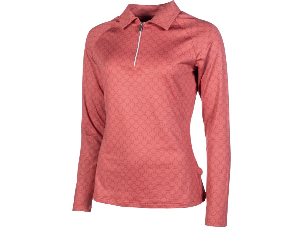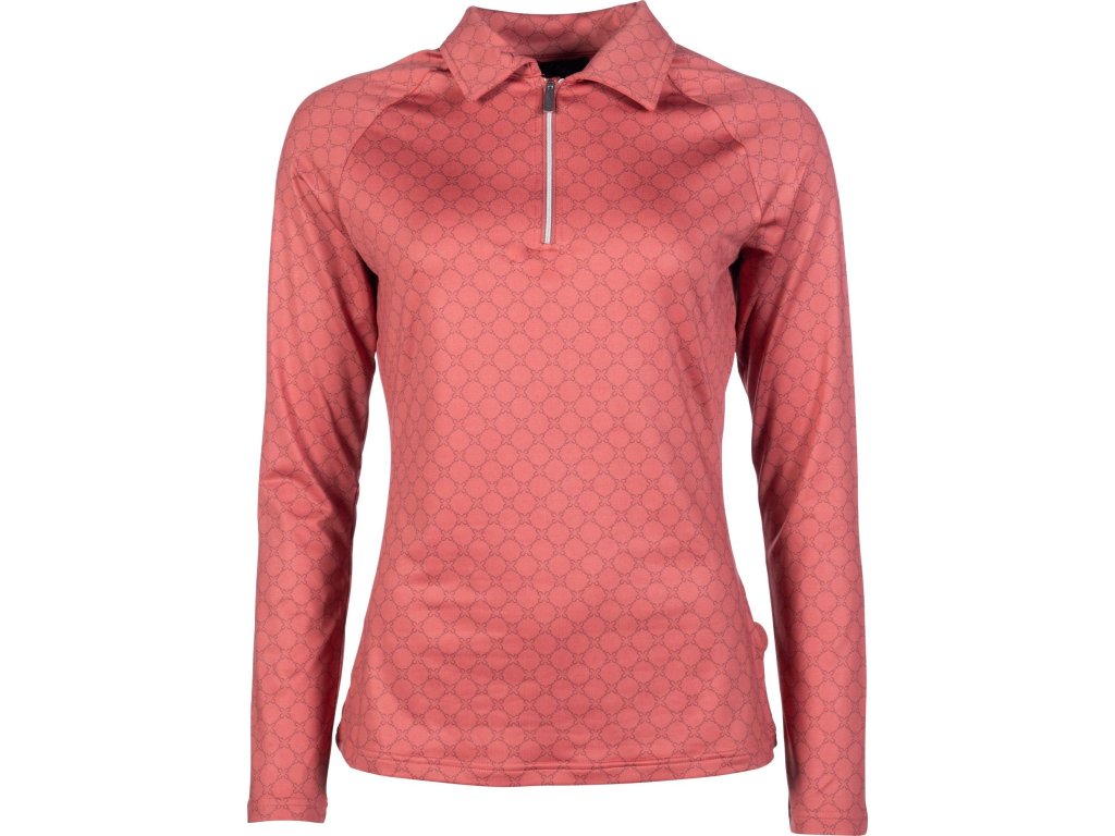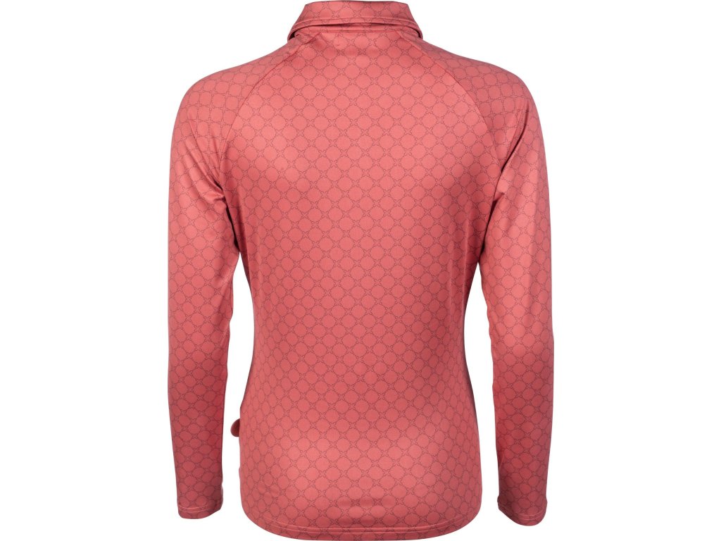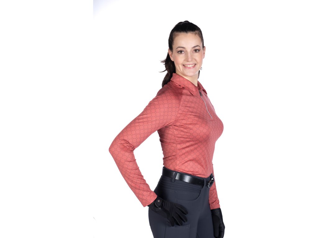 Elegancki funkcjonalny T-shirt ze wzorem na całej powierzchni firmy HKM. Wykonana z poliestru i elastanu. Jest wysoce oddychająca, elastyczna i ma dopasowany krój. Wyposażona w kołnierz i krótki zamek błyskawiczny z przodu z osłoną podbródka. Można prać w pralce w programie do tkanin delikatnych w temperaturze 30°C. Dostępne w wielu kolorach. Dostępne rozmiary XS - XXL. Idealnie pasują do innych produktów z kolekcji Rosewood.