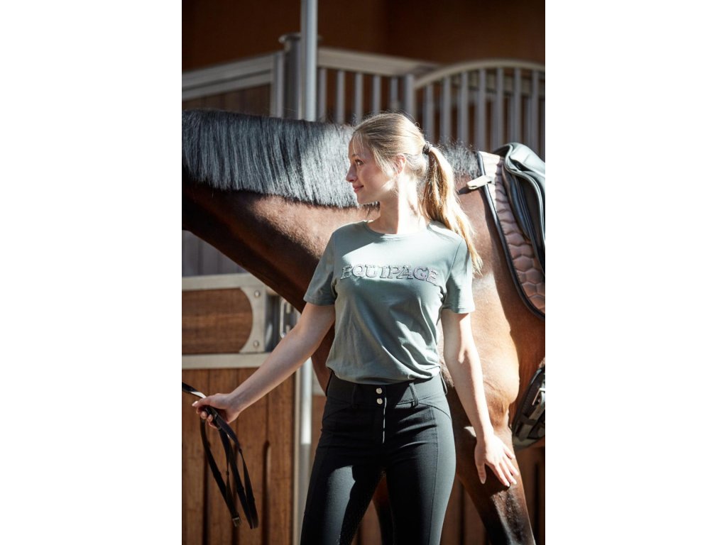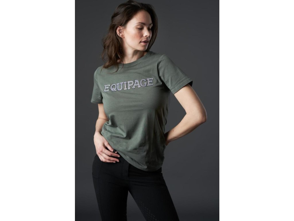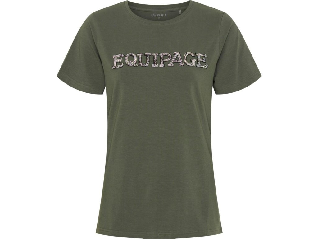 Sportowa koszulka z krótkim rękawem i okrągłym dekoltem od Equipage. T-shirt ozdobiony jest charakterystycznym napisem z logo marki, który jest ozdobiony dżetami. Materiał koszulki wykonany jest z bawełny i elastanu, co zapewnia jego oddychalność i elastyczność. Dostępna w wielu rozmiarach. Nadaje się do stajni i innych aktywności rekreacyjnych. Zalecamy pranie na lewej stronie w delikatnych programach.