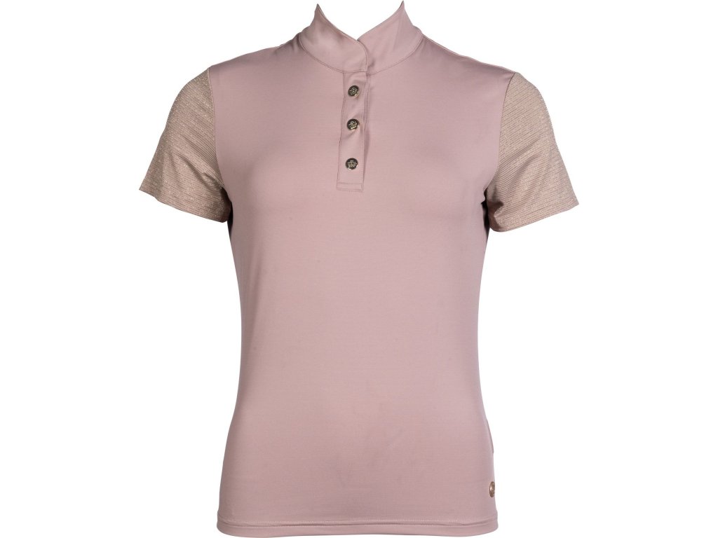 Wysokiej jakości t-shirt wykonany z poliestru i elastanu. Jest wysoce oddychająca, elastyczna i ma dopasowany krój. Wyposażony w kołnierzyk i zapięcie na zatrzaski. Ozdobiony brokatowymi rękawami i logo firmy HKM z boku. Można prać w pralce w temperaturze 30 °C i suszyć w suszarce bębnowej na zimno. Dostępne w wielu kolorach. Idealnie pasuje do innych produktów z Lavender Bay collection.