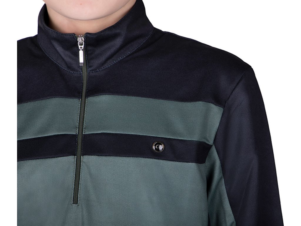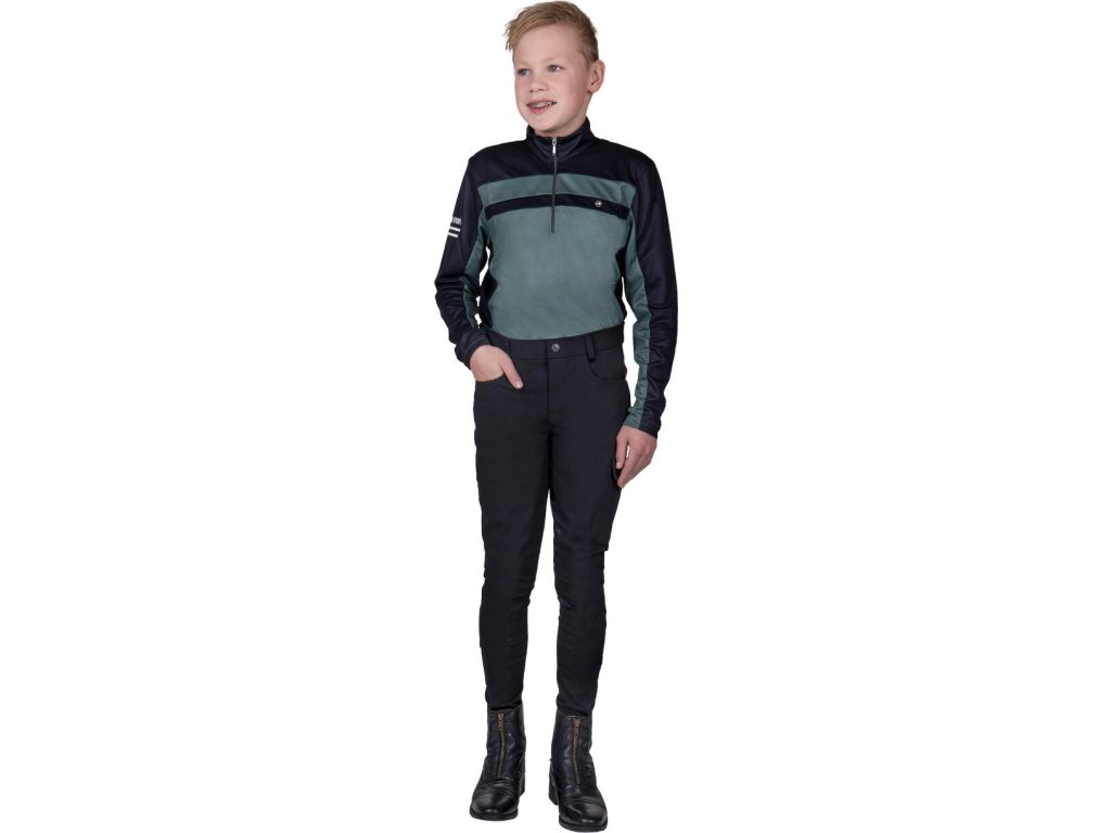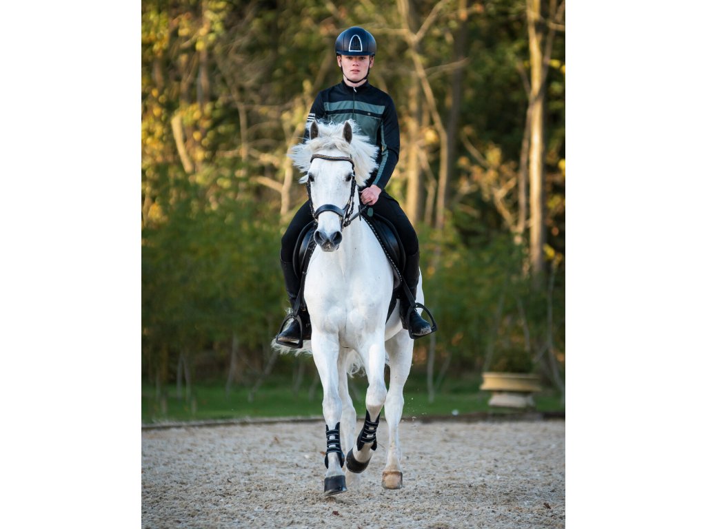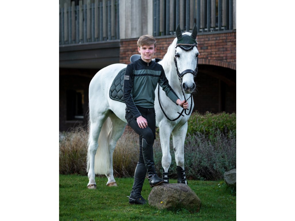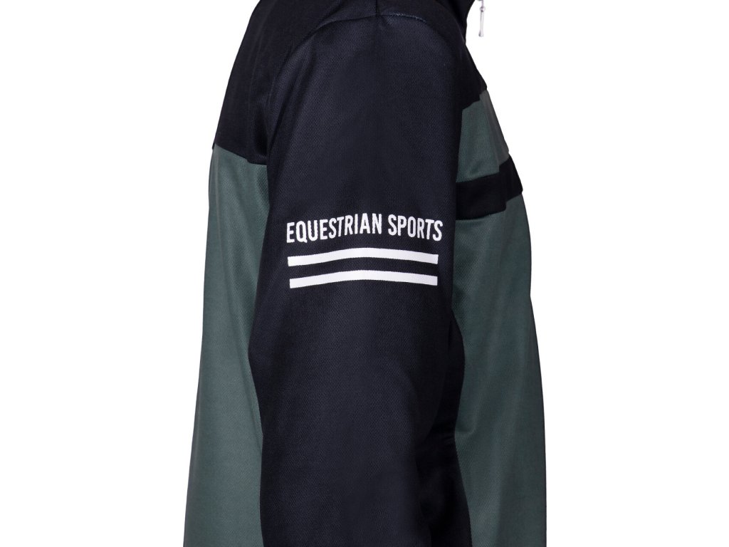 Wysokiej jakości koszulka dziecięca wykonana z materiału, który odprowadza wilgoć i jest szybkoschnący. Posiada długie rękawy, wyższy kołnierz i krótki zamek błyskawiczny przy szyi. Ozdobiony napisem "Equestrian Sports" na prawym ramieniu. Dwukolorowy design nadaje T-shirtowi sportowy wygląd. Koszulka jest również dostępna w rozmiarach dla dorosłych. Część kolekcji jesień/zima 2023/2024.
