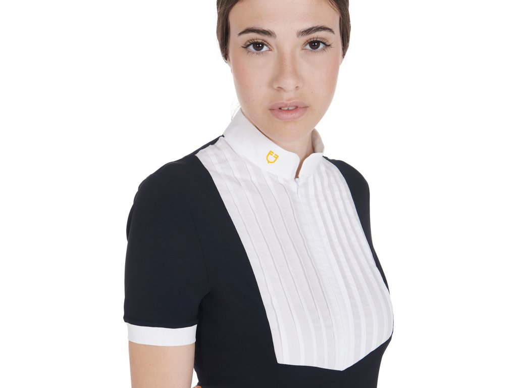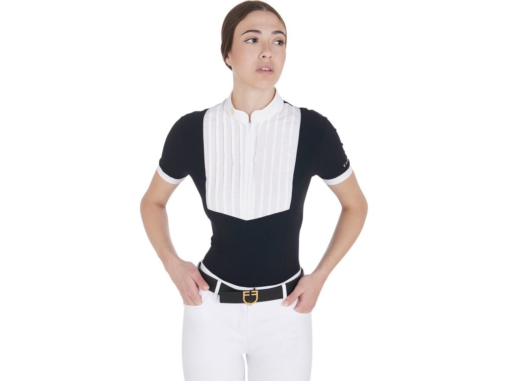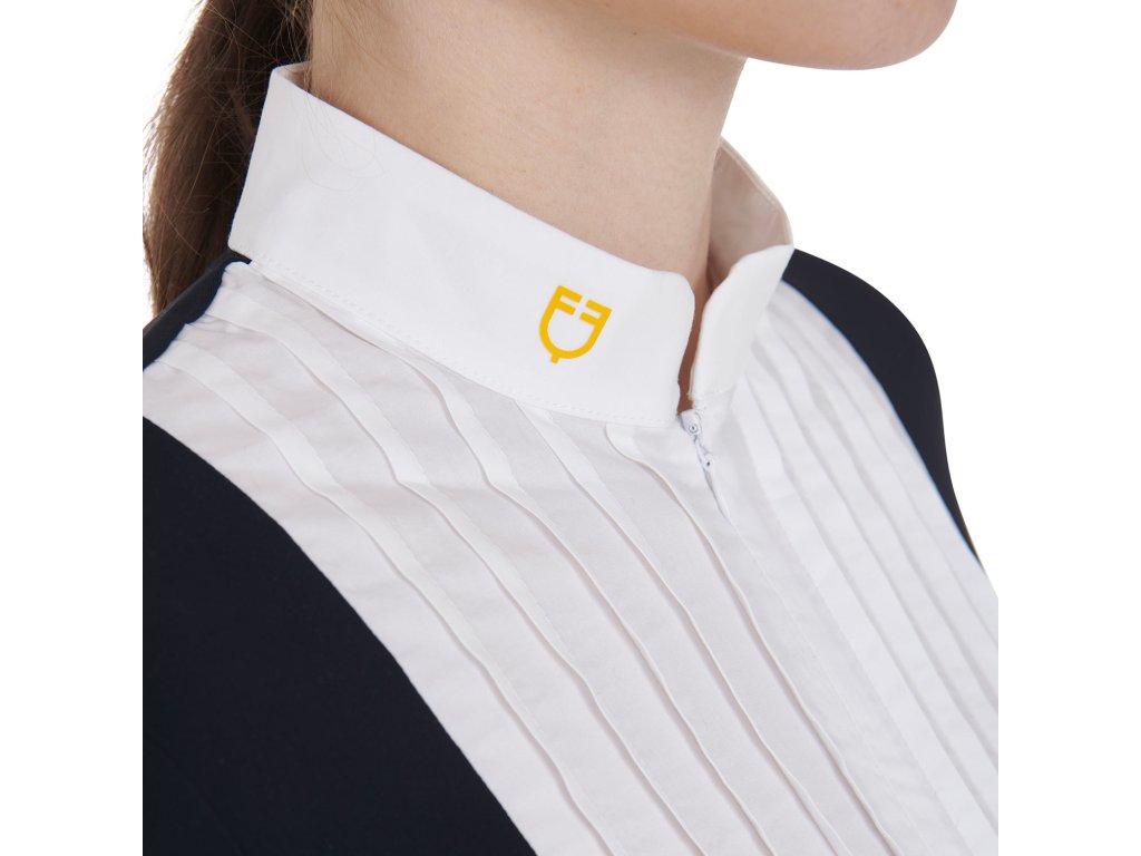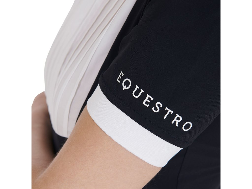 Bardzo wysokiej jakości dopasowana, koszula konkursowa z krótkim rękawem. Wykonana z oddychającego materiału technicznego i bawełny plisowanej na piersi. Idealnie dopasowuje się i zapewnia całkowitą swobodę ruchów. Wyposażona w długi zamek błyskawiczny, kołnierzyk z logo Equestro i napis na rękawie. Dostępne w wielu kolorach. W rozmiarach XS - XL.
