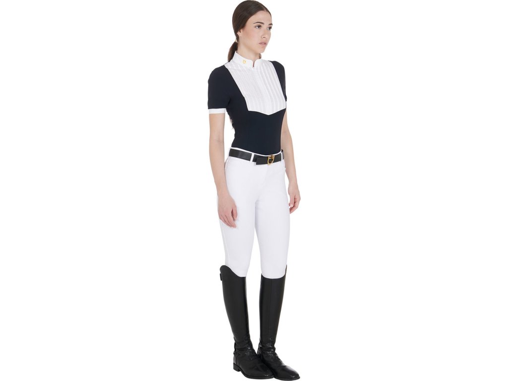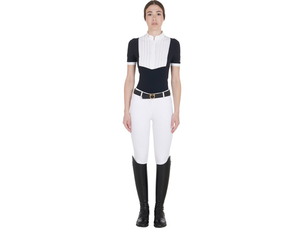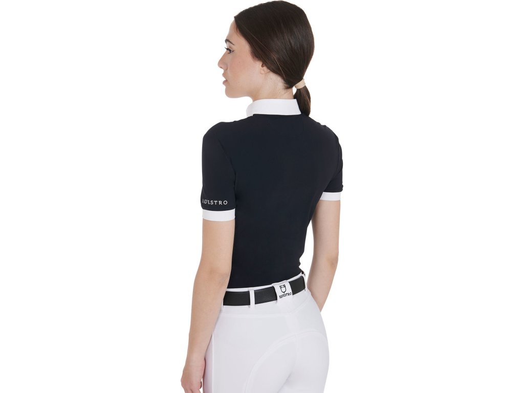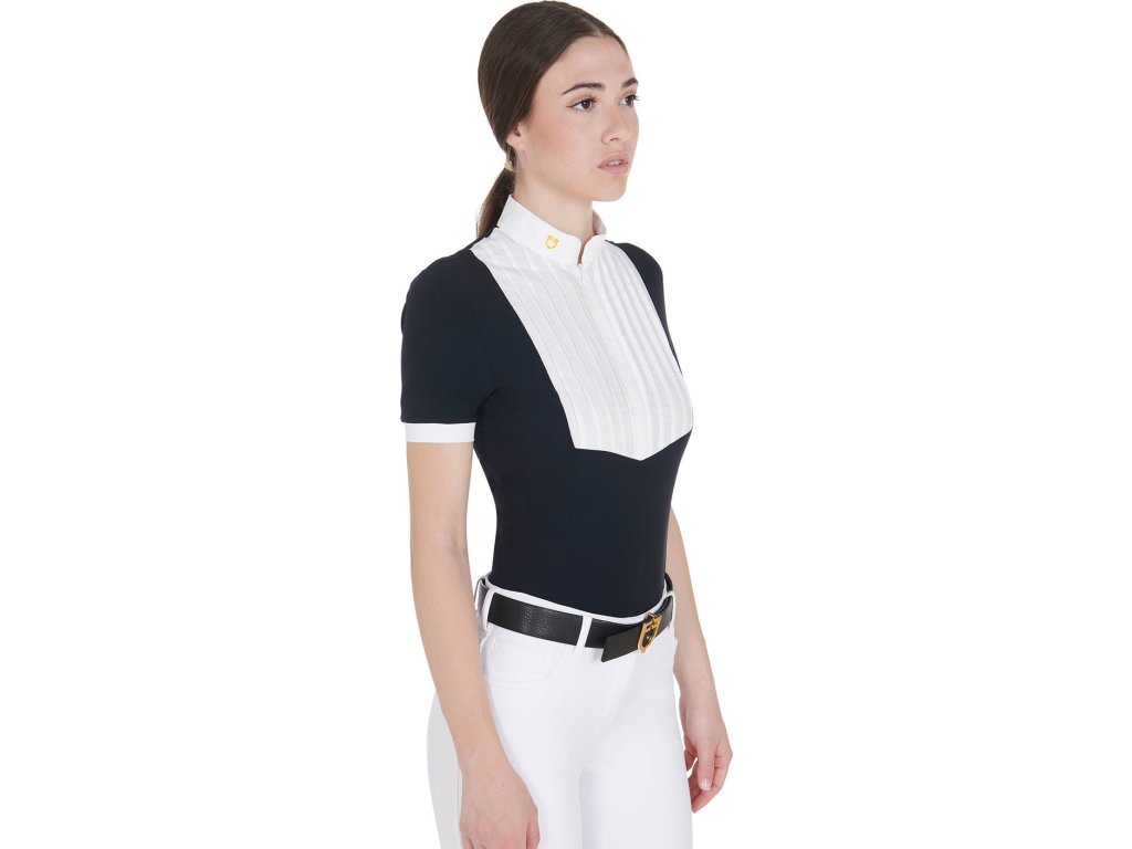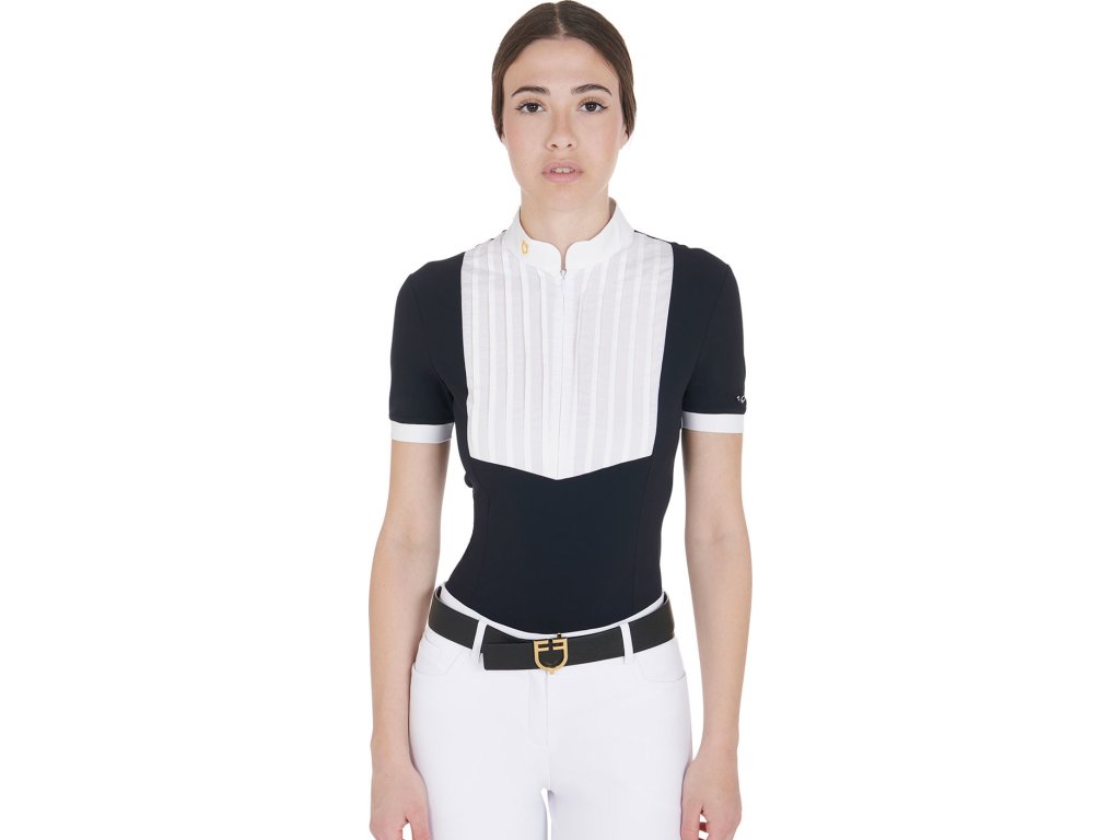 Bardzo wysokiej jakości dopasowana, koszula konkursowa z krótkim rękawem. Wykonana z oddychającego materiału technicznego i bawełny plisowanej na piersi. Idealnie dopasowuje się i zapewnia całkowitą swobodę ruchów. Wyposażona w długi zamek błyskawiczny, kołnierzyk z logo Equestro i napis na rękawie. Dostępne w wielu kolorach. W rozmiarach XS - XL.