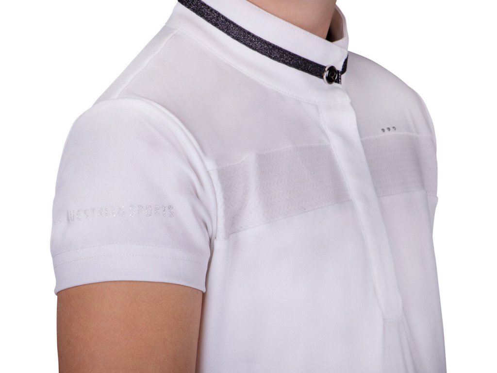 Koszulka o bardzo wysokiej jakości, odpowiednia do zawodów. Wykonana jest z oddychającego i szybkoschnącego materiału, który doskonale odprowadza wilgoć. Ma krótkie rękawy i wyższy kołnierz przy szyi. Ozdobiona jest czarną, brokatową lamówką na kołnierzu i małym napisem "Equestrian Sports" na rękawie. Koszulka jest również dostępna w rozmiarach dla dorosłych i idealnie pasuje do innych produktów z kolekcji Kae. Część kolekcji jesień/zima 2023/2024.