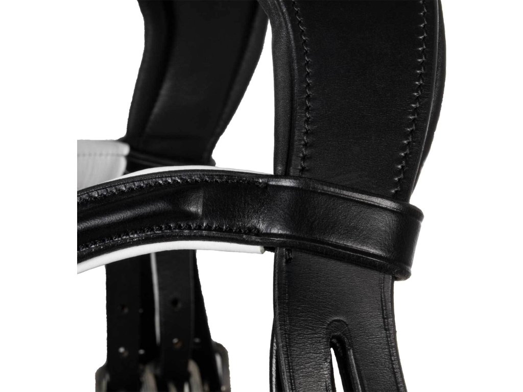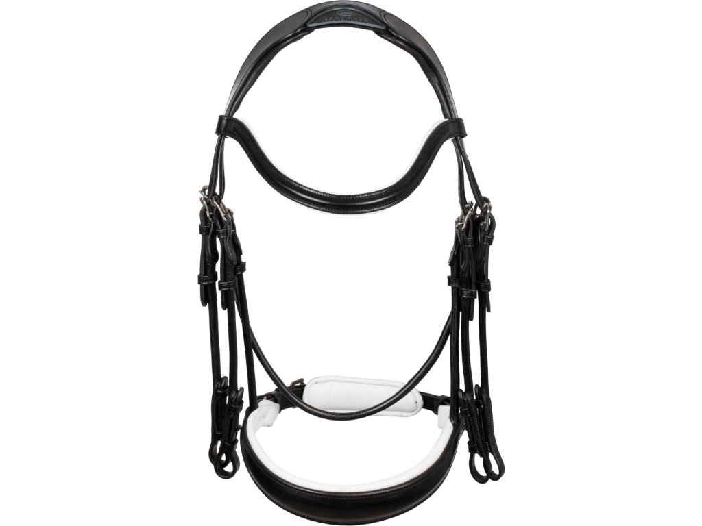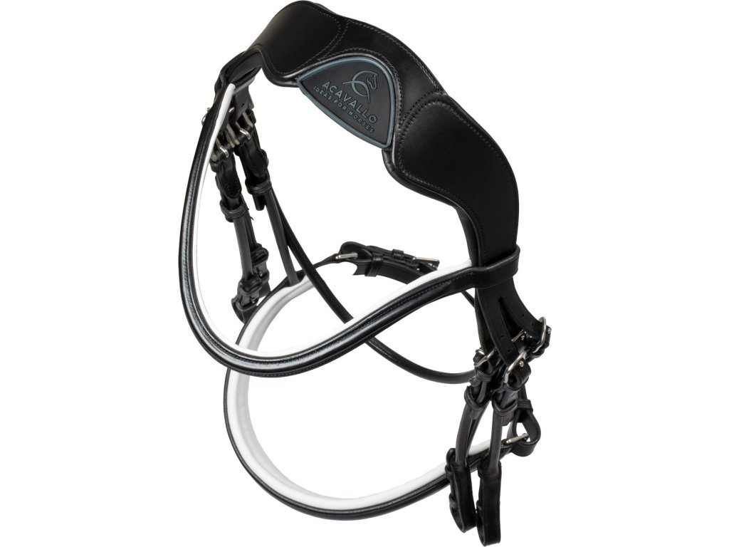 Wysokiej jakości ogłowie wykonane z bardzo miękkiej naturalnej włoskiej skóry bydlęcej z szerokim szwedzkim nachrapnikiem i białym podszyciem. Posiada szeroki ergonomiczny i anatomicznie ukształtowany pasek potyliczny. Pozycję części policzkowych można regulować za pomocą innowacyjnego, opatentowanego, łatwego w regulacji systemu (metalowe urządzenie przesuwne), który zapobiega uciskaniu nerwów policzkowych, mięśni i stawów żuchwowych, dzięki czemu koń może gryźć i oddychać w sposób bardziej naturalny niż w przypadku konwencjonalnych ogłowi. System ten umożliwia regulację części policzkowych tak, aby nie naciskały na kość, zapobiegając otarciom. Wyściółka lateksowa na pasku potylicznym ze specjalną elastyczną wkładką zmniejsza nacisk na potylicę i kręgosłup szyjny - jest to jeden z najczulszych obszarów konia, dzięki wolnej przestrzeni (w obszarze logo Acavallo) nacisk na potylicę nie jest tak duży, rozkłada się bardziej równomiernie, co zapewnia koniowi komfort. Paski policzkowe są wykonane z okrągłej skóry, ogłowie ma skórzany pasek potyliczny z białym podszyciem, a okucia są wykonane ze stali nierdzewnej. Ogłowie pasuje idealnie i jest wyposażone w wodze. Kolekcja ACAVALLO Leather Passion.