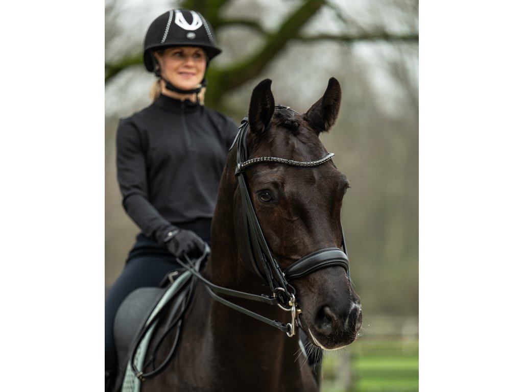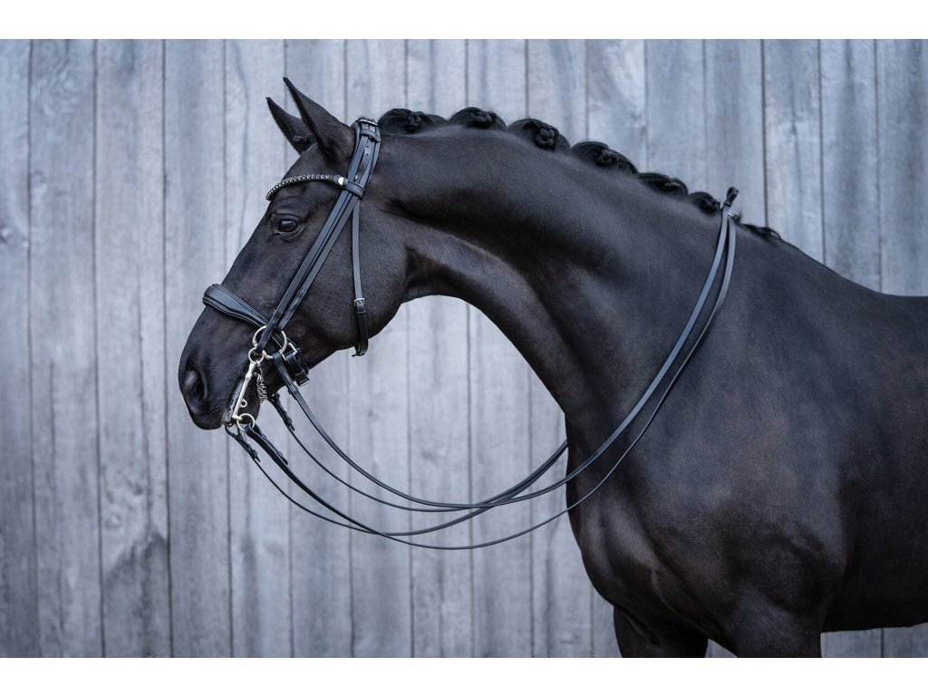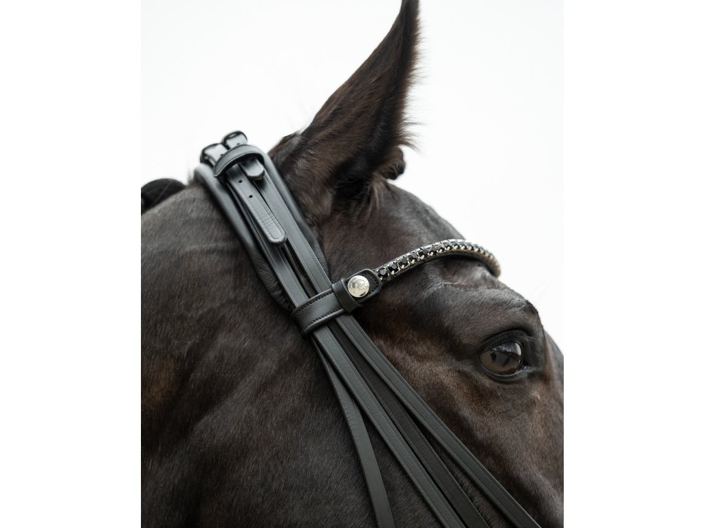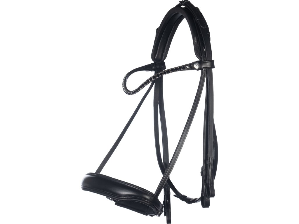 Ogłowie munsztukowe wykonane z wysokiej jakości skóry. Wyposażone w wyjątkowo miękkie podszycie na nachrapniku i potylicy. Wyposażone w szwedzki nachrapnik. Naczółek ma zakrzywiony kształt i jest ozdobiony dużymi cyrkoniami. Można go łatwo zdjąć dzięki zapięciu na zatrzask. W zestawie znajdują się dwie skórzane wodze, jedna o szerokości 12 mm, a druga o szerokości 16 mm. Pasek potyliczny jest regulowany z obu stron.