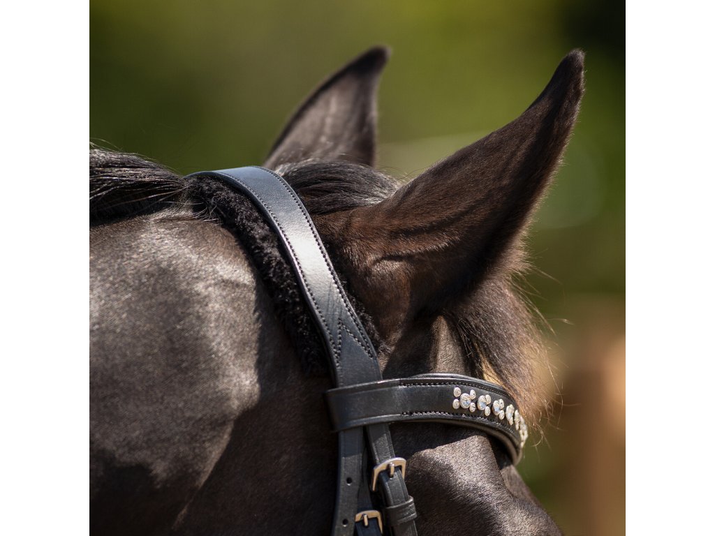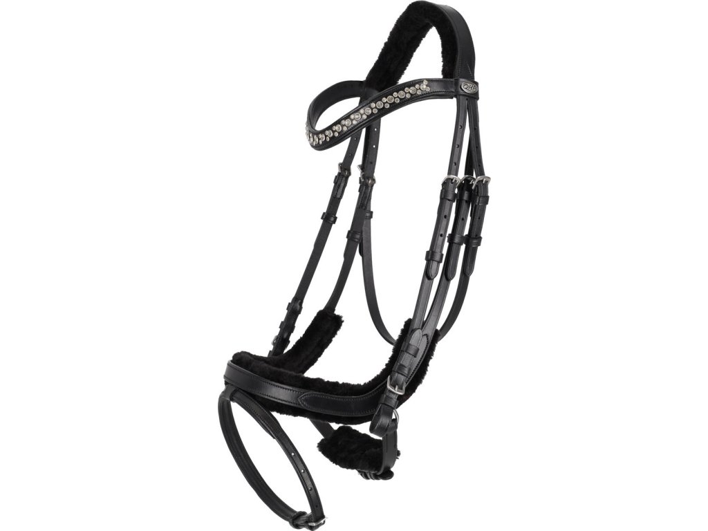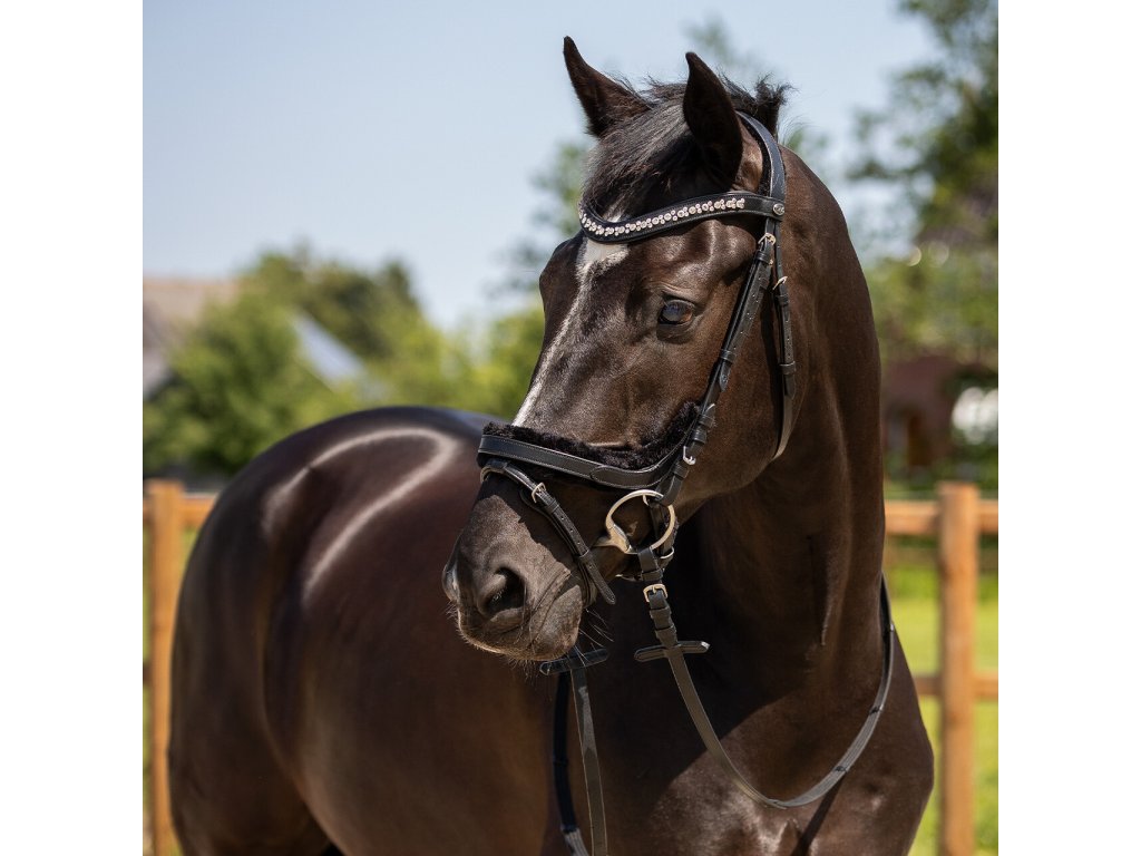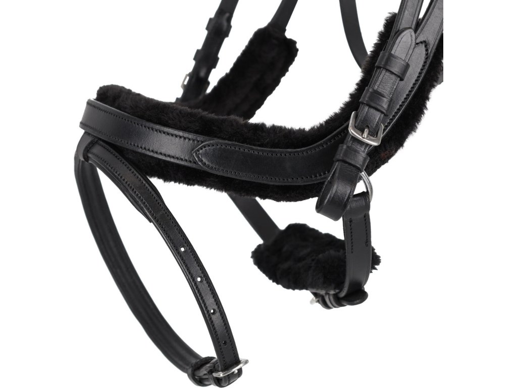 Anatomiczne ogłowie z wyjmowaną miękką wyściółką wykonaną z syntetycznego futra zostało zaprojektowane z naciskiem na wygodę konia. Anatomicznie ukształtowany nachrapnik w połączeniu z lekko wyciętym paskiem potylicznym równomiernie rozprowadza nacisk i odciąża wrażliwe miejsca na głowie. Wyściółkę ze sztucznego futra można odpiąć za pomocą rzepu i prać w pralce. Falisty naczółek nadaje ogłowiu elegancki wygląd, a miękkie wypełnienie pod naczółkiem i paskiem podtrzymującym zwiększa komfort. Podwójnie regulowane podgardle umożliwia precyzyjną regulację rozmiaru. Ogłowie wykonane jest z wysokiej jakości skóry i uzupełnione trwałymi okuciami ze stali nierdzewnej. Ogłowie zawiera pasujące wodze wykonane z tkaniny. Aby zachować jakość skóry, zalecamy czyszczenie ogłowia odpowiednim środkiem czyszczącym, a następnie konserwację za pomocą środka do pielęgnacji skóry. Nie zaleca się stosowania oleju, ponieważ może to prowadzić do rozluźnienia szwów. Przed użyciem w zawodach zalecamy sprawdzenie z odpowiednią federacją krajową, czy tego typu ogłowie jest dozwolone.