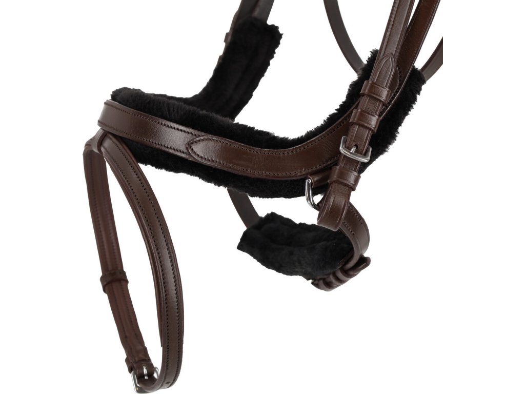 Anatomiczne ogłowie z wyjmowaną miękką wyściółką wykonaną z syntetycznego futra zostało zaprojektowane z naciskiem na wygodę konia. Anatomicznie ukształtowany nachrapnik w połączeniu z lekko wyciętym paskiem potylicznym równomiernie rozprowadza nacisk i odciąża wrażliwe miejsca na głowie. Wyściółkę ze sztucznego futra można odpiąć za pomocą rzepu i prać w pralce. Falisty naczółek nadaje ogłowiu elegancki wygląd, a miękkie wypełnienie pod naczółkiem i paskiem podtrzymującym zwiększa komfort. Podwójny regulowany pasek podgardlany umożliwia precyzyjne dopasowanie rozmiaru. Ogłowie wykonane jest z wysokiej jakości skóry i uzupełnione trwałymi okuciami ze stali nierdzewnej. Ogłowie zawiera pasujące wodze wykonane z tkaniny. Aby zachować jakość skóry, zalecamy czyszczenie ogłowia odpowiednim środkiem czyszczącym, a następnie konserwację za pomocą środka do pielęgnacji skóry. Nie zaleca się stosowania oleju, ponieważ może to prowadzić do rozluźnienia szwów. Przed użyciem w zawodach zalecamy sprawdzenie z odpowiednią federacją krajową, czy tego typu ogłowie jest dozwolone.