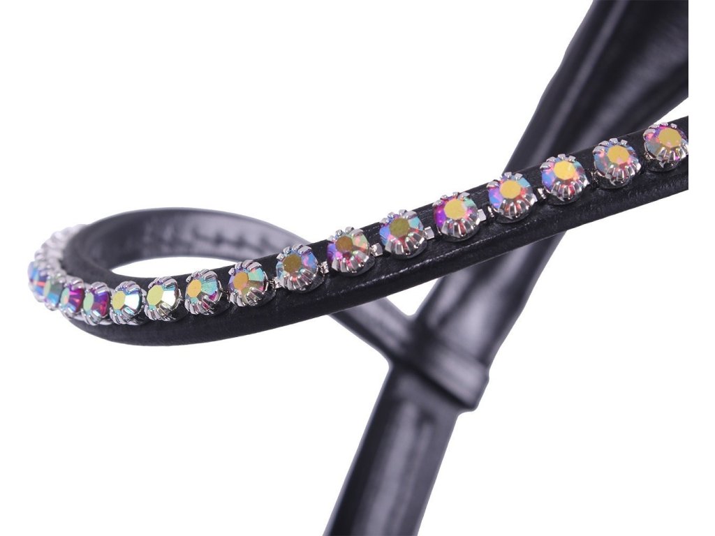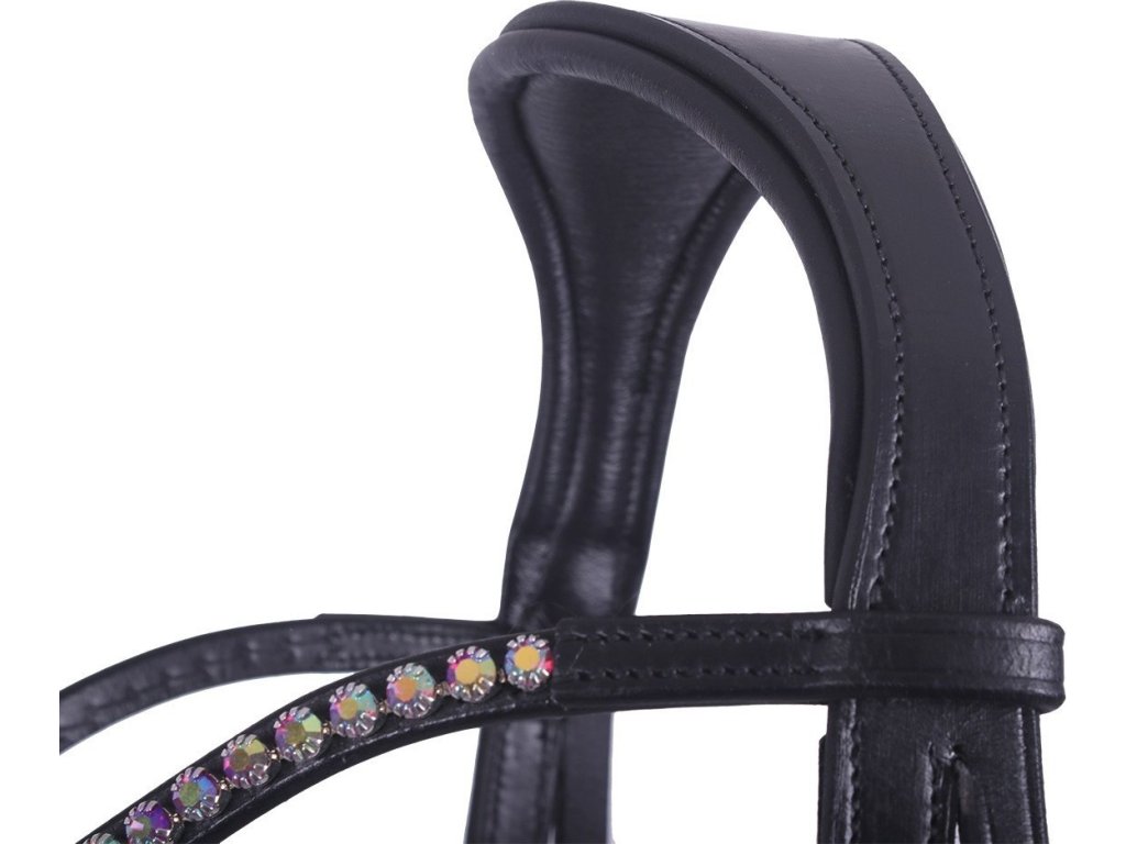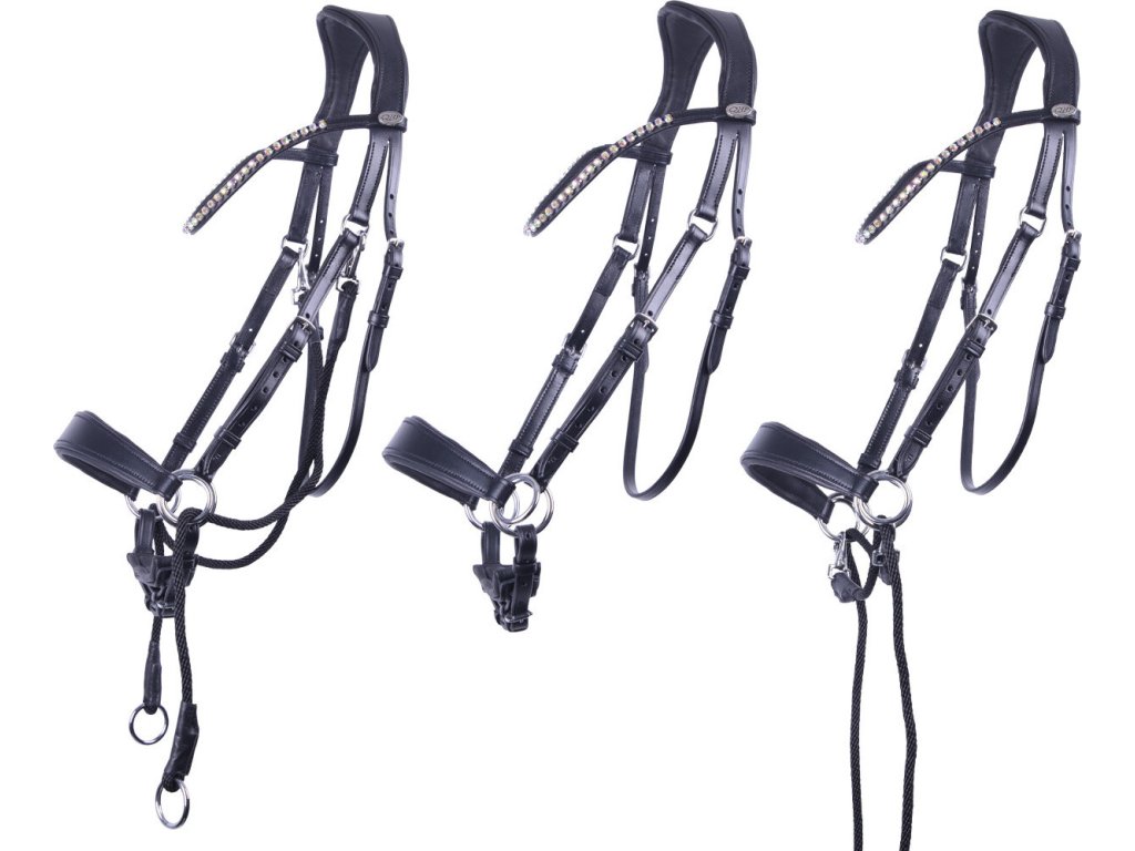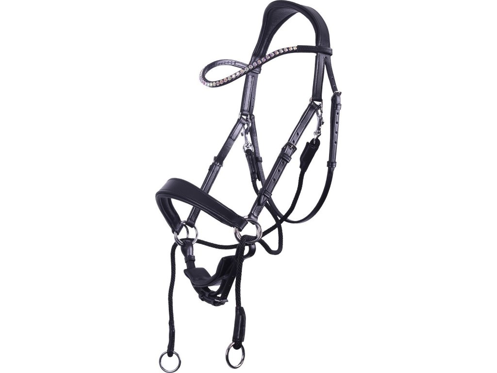 Anatomicznie ukształtowane, wielofunkcyjne uzda bezwędzidłowe, które można używać na kilka sposobów. Ozdobione błyszczącymi cyrkoniami w różnych kolorach. Anatomiczny pasek potyliczny zmniejsza nacisk na uszy. Ogłowie ma miękkie wyściełanie dla maksymalnego komfortu. Wyposażone w szeroki nachrapnik, podwójne zapięcie i klipsy na paskach i wodzach dla łatwej regulacji rozmiaru. Część pod brodą można odłączyć. Pasujące wodze w zestawie.