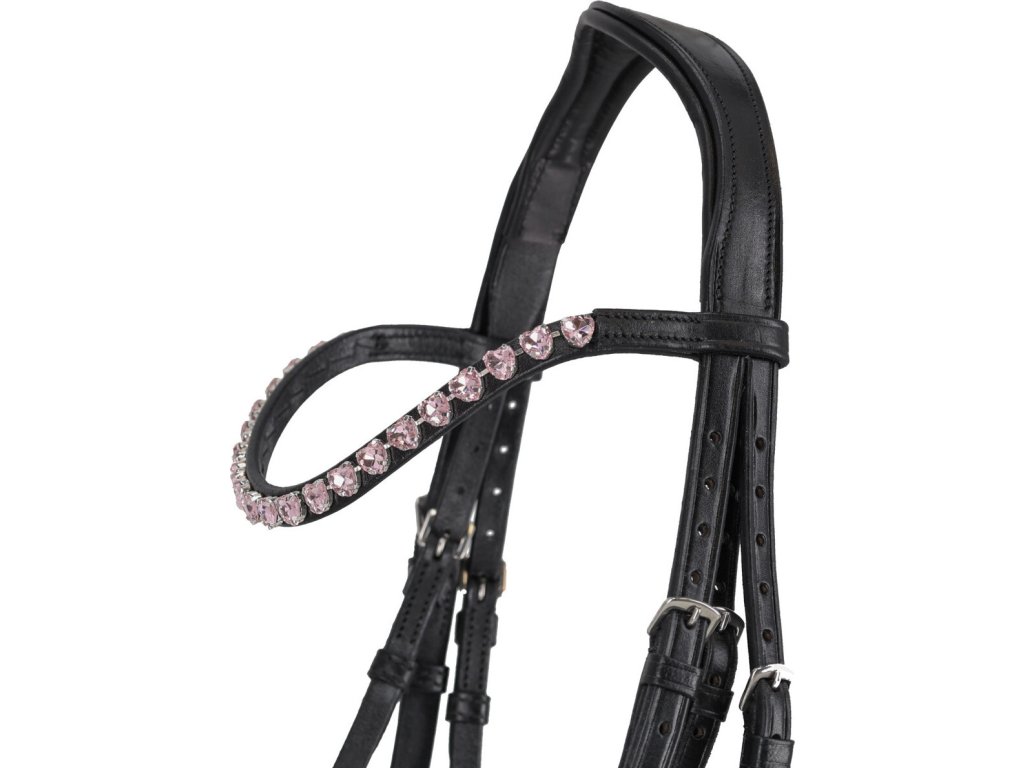 Eleganckie, anatomicznie ukształtowane skórzane ogłowie dla kucyka. Wyposażone jest w angielski kombinowany nachrapnik w błyszczącym wykończeniu z delikatnymi, połyskującymi detalami w kolorze srebrnym i miękkim podszyciem. Naczółek jest ozdobiony dżetami w kształcie serc. Anatomicznie ukształtowany i miękko wyściełany pasek potyliczny zapewnia maksymalny komfort. Ogłowie jest dostarczane w zestawie z wodzami z tkaniny.