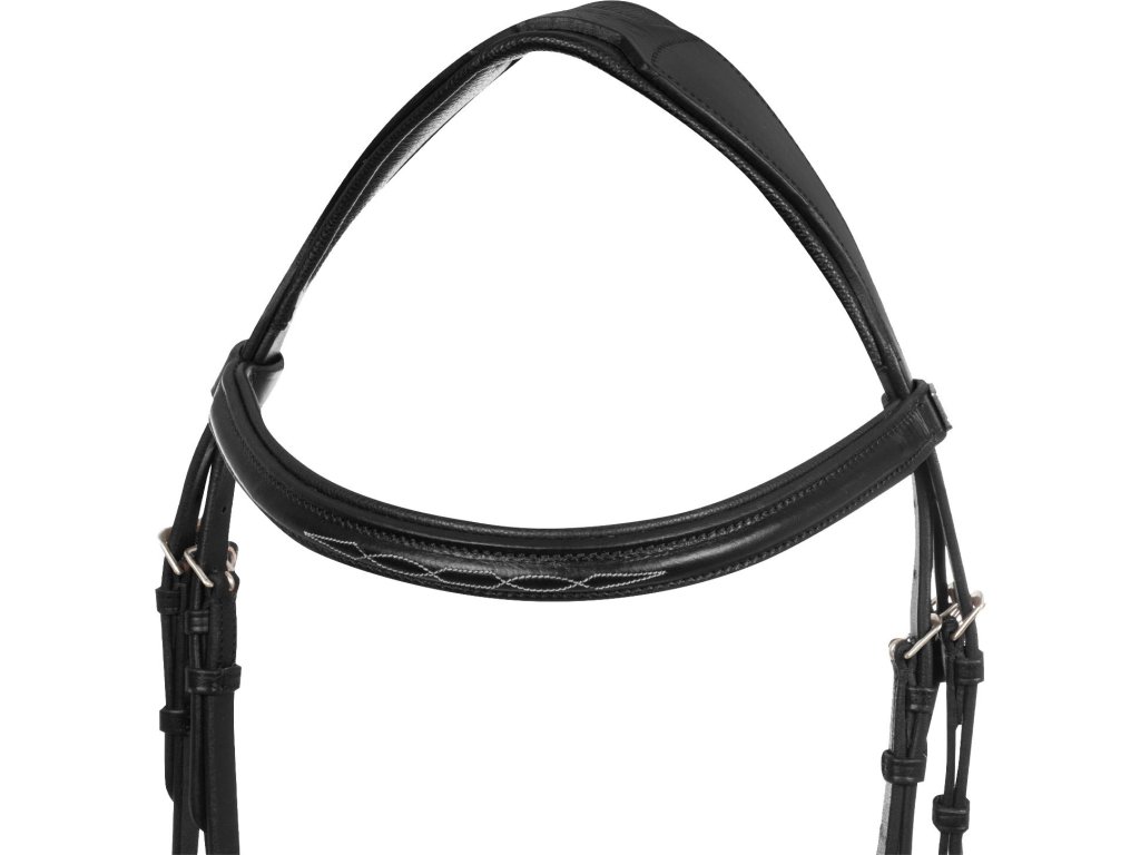 Wysokiej jakości ogłowie wykonane z miękkiej skóry, wyściełane aby zapewnić maksymalny komfort dla konia. Wyposażone w nachrapnik kombinowany. Anatomicznie ukształtowany pasek potyliczny zapewnia lepsze dopasowanie, rozprowadzając nacisk wywierany na najbardziej wrażliwy obszar potylicy na większej powierzchni. Naczółek i nachrapnik są ozdobione kontrastowymi przeszyciami. Wyposażone w sprzączki ze stali nierdzewnej, które gwarantują wyjątkową trwałość. Dostarczane z gumowymi wodzami. Dostępne w kolorze brązowym. Dostępny w rozmiarach Shetland, Pony, Cob i Full.
