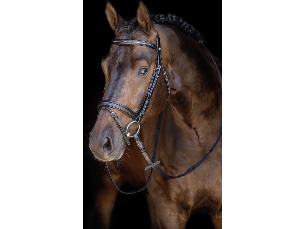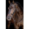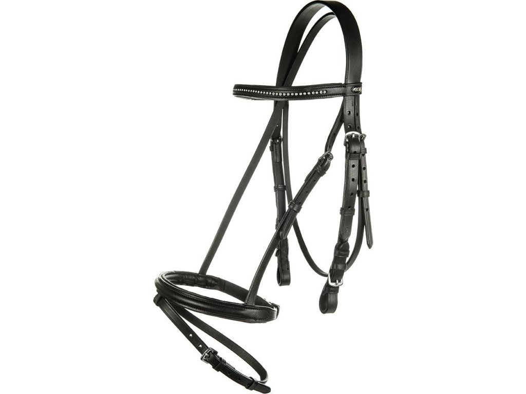 Wysokiej jakości ogłowie z nachrapnikiem kombinowanym angielskim wykonane ze skóry bydlęcej. Wyposażone w okucia w kolorze srebrnym. Naczółek ozdobiony błyszczącymi cyrkoniami. Zawiera wodze parciane ze skórzanymi stoperami. Dostępne w kolorze czarnym oraz w rozmiarach Pony, Cob i Full.