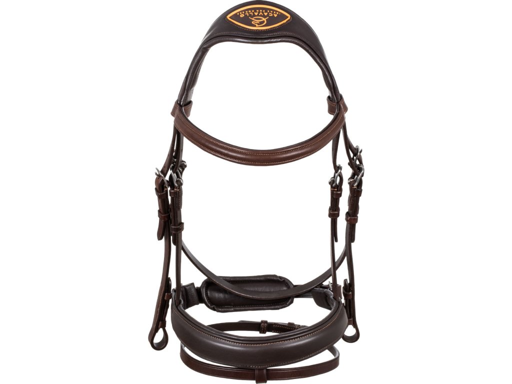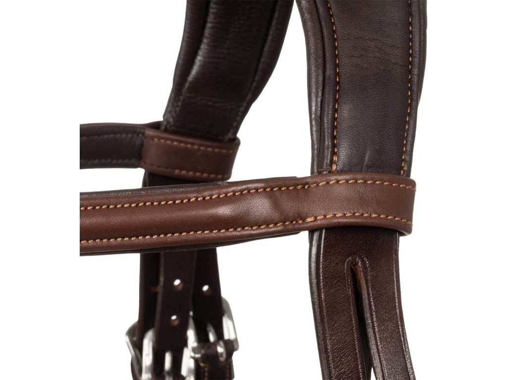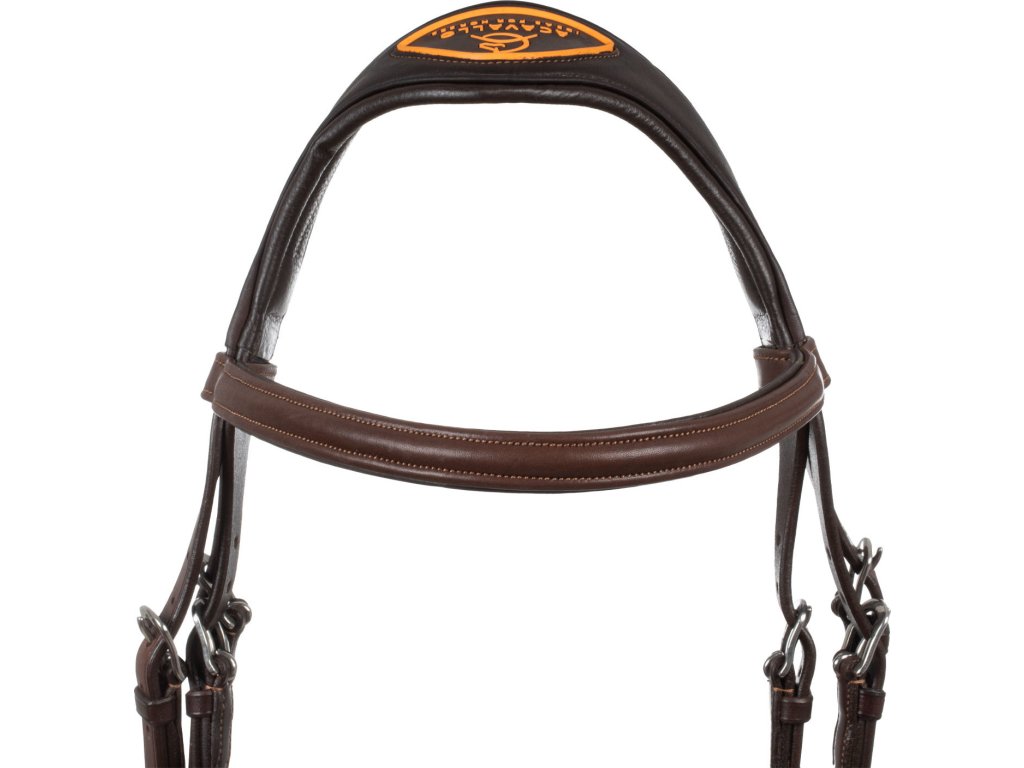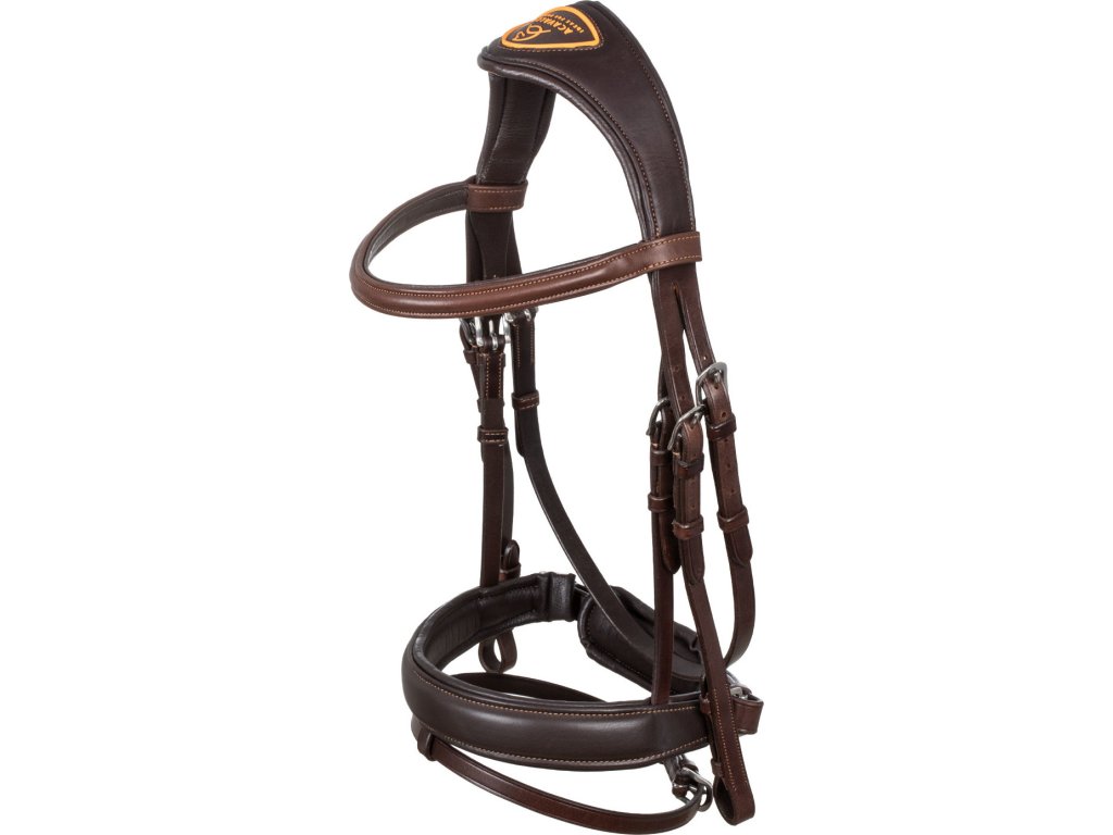 Wysokiej jakości ogłowie wykonane z bardzo miękkiej oryginalnej włoskiej skóry bydlęcej z szerokim szwedzkim nachrapnikiem kombinowanym. Szeroki, ergonomiczny i anatomicznie wyprofilowany pasek potyliczny zapewniają wygodę. Pozycję części policzkowych można regulować za pomocą innowacyjnego, opatentowanego, łatwego w regulacji systemu (metalowe urządzenie przesuwne), który zapobiega uciskaniu nerwów policzkowych, mięśni i stawów żuchwowych, dzięki czemu koń może gryźć i oddychać w sposób bardziej naturalny niż w przypadku konwencjonalnych ogłowi. System ten umożliwia regulację części policzkowych tak, aby nie naciskały na kość, zapobiegając otarciom. Gruba wyściółka lateksowa w pasku potylicznym, w całości skórzany naczółek i okucia ze stali nierdzewnej.