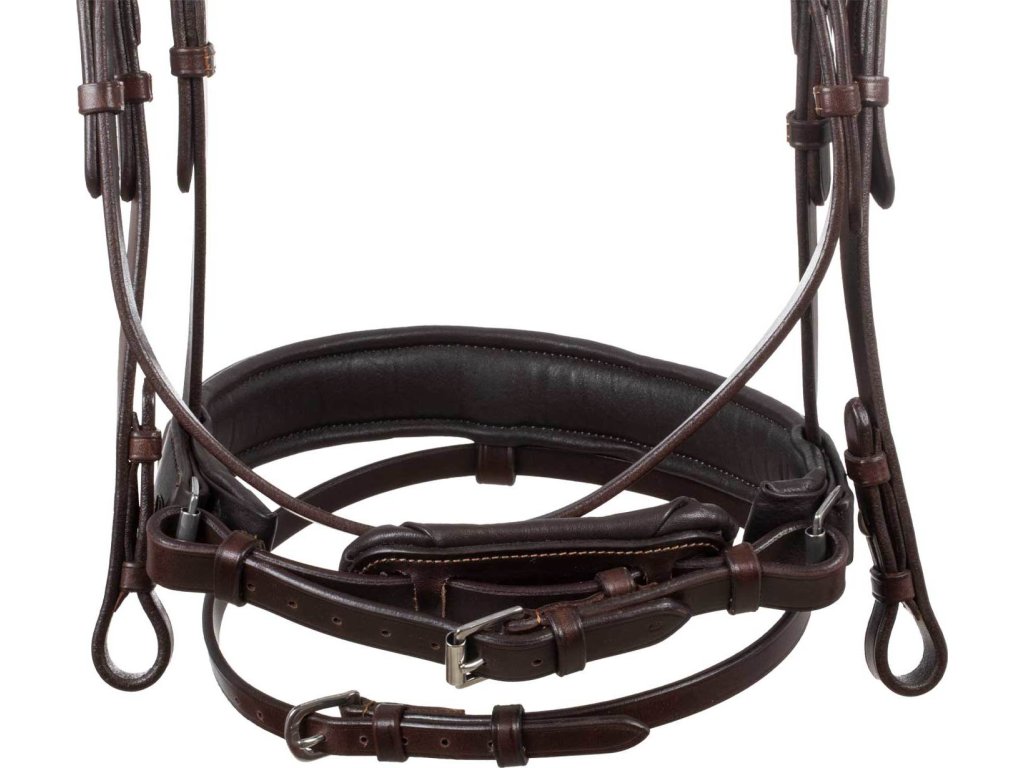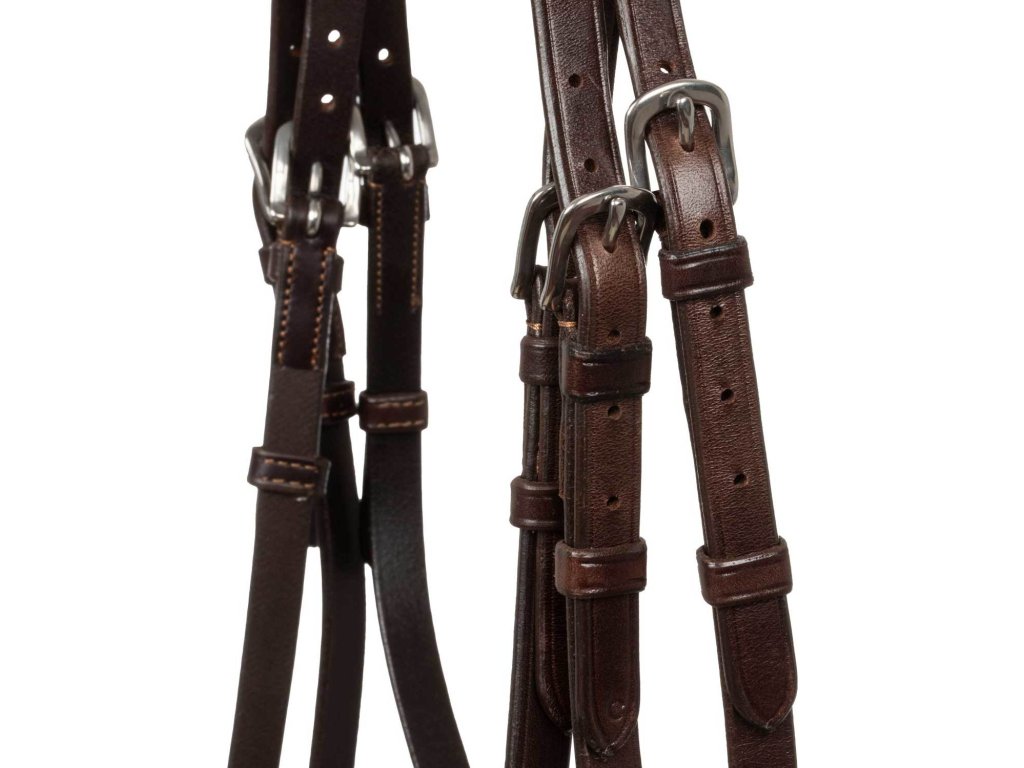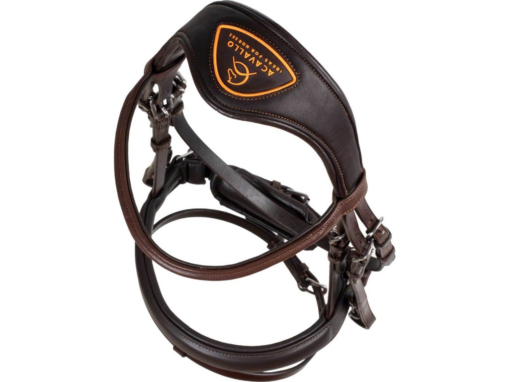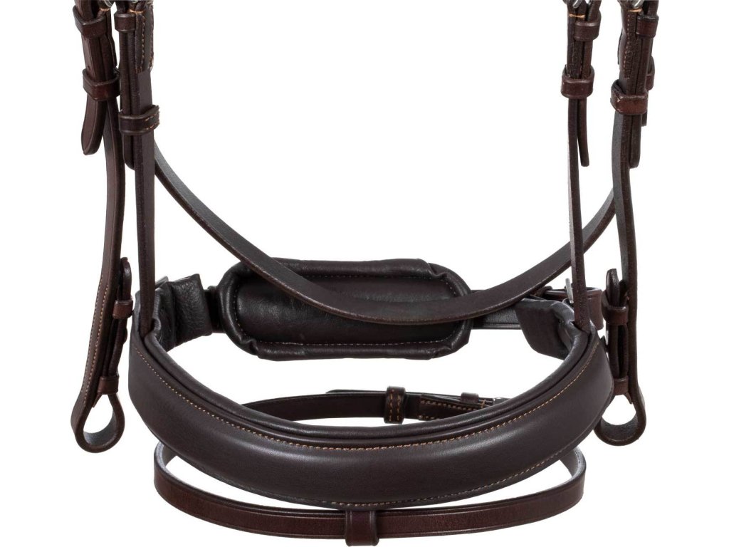 Wysokiej jakości ogłowie wykonane z bardzo miękkiej oryginalnej włoskiej skóry bydlęcej z szerokim szwedzkim nachrapnikiem kombinowanym. Szeroki, ergonomiczny i anatomicznie wyprofilowany pasek potyliczny zapewniają wygodę. Pozycję części policzkowych można regulować za pomocą innowacyjnego, opatentowanego, łatwego w regulacji systemu (metalowe urządzenie przesuwne), który zapobiega uciskaniu nerwów policzkowych, mięśni i stawów żuchwowych, dzięki czemu koń może gryźć i oddychać w sposób bardziej naturalny niż w przypadku konwencjonalnych ogłowi. System ten umożliwia regulację części policzkowych tak, aby nie naciskały na kość, zapobiegając otarciom. Gruba wyściółka lateksowa w pasku potylicznym, w całości skórzany naczółek i okucia ze stali nierdzewnej.