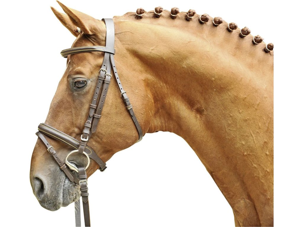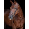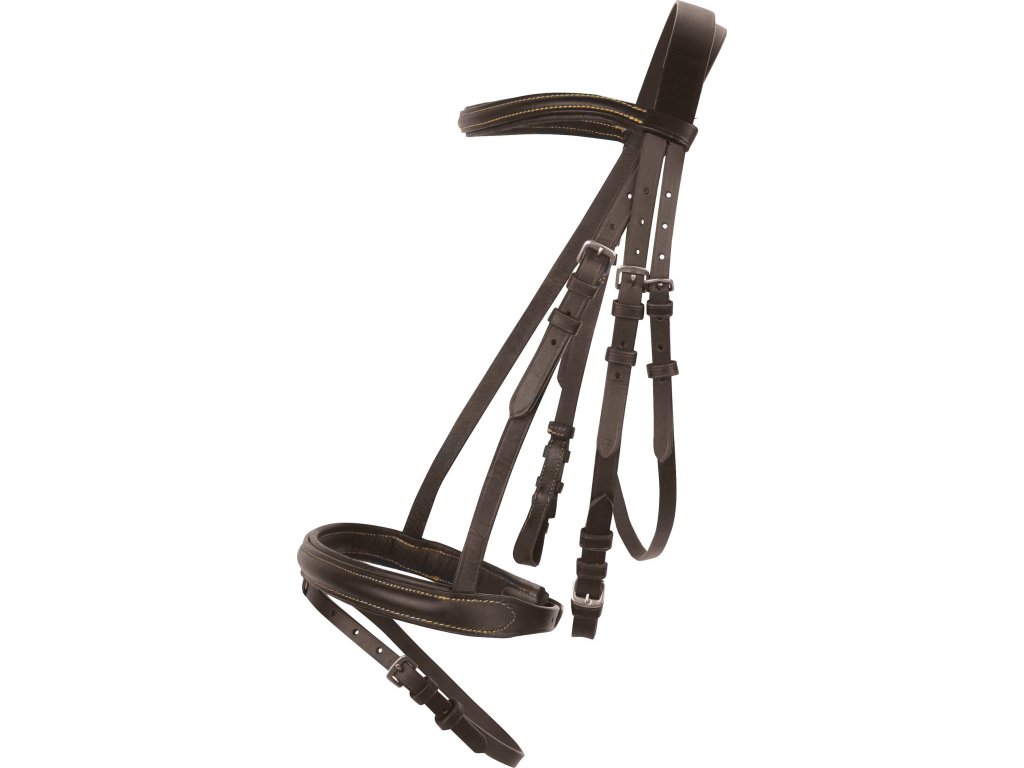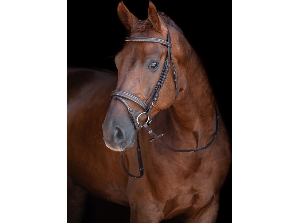 Wysokiej jakości ogłowie z angielskim nachrapnikiem kombinowanym, wykonane ze skóry bydlęcej. Wyposażone w okucia w kolorze srebrnym. Naczółek i nachrapnik ozdobione kontrastowymi przeszyciami. Zawiera wodze parciane ze skórzanymi stoperami. Dostępne również w kolorze czarnym. Dostępny w rozmiarach Shetty, Pony, Cob i Full.