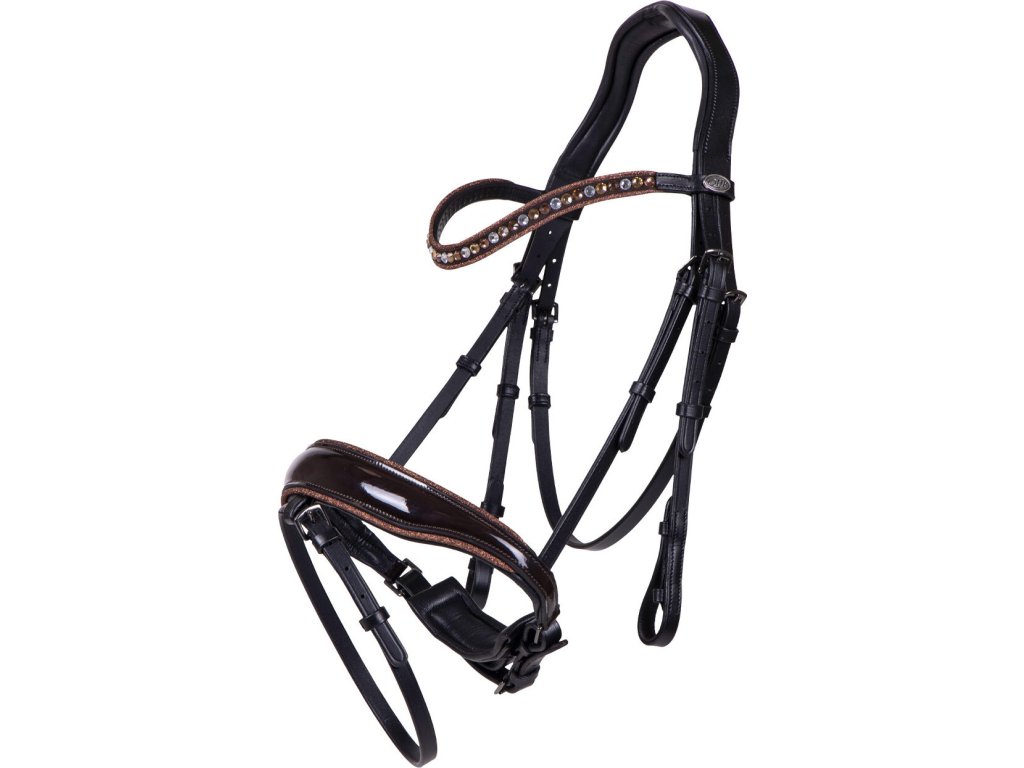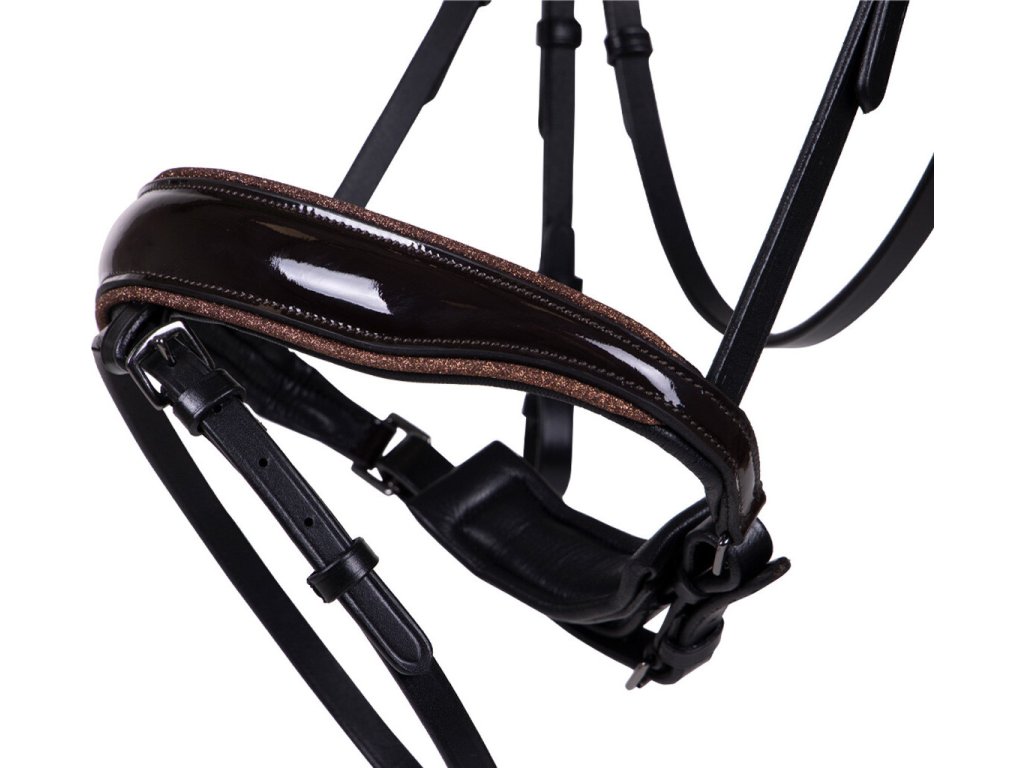 Wysokiej jakości ogłowie ze skóry, które jest doskonałym połączeniem elegancji i komfortu. Posiada anatomicznie ukształtowany nagłówek i nachrapnik w stylu szwedzkim, które są również miękko wyściełane dla maksymalnego komfortu. Falowany naczółek jest wyposażony w duże i małe cyrkonie, które pięknie się mienią. Ogłowie jest ozdobione lakierowanym nachrapnikiem, który jest wyściełany brokatem. Ogłowie jest dostarczane z wodzami i jest dostępne w kilku pięknych kolorach.