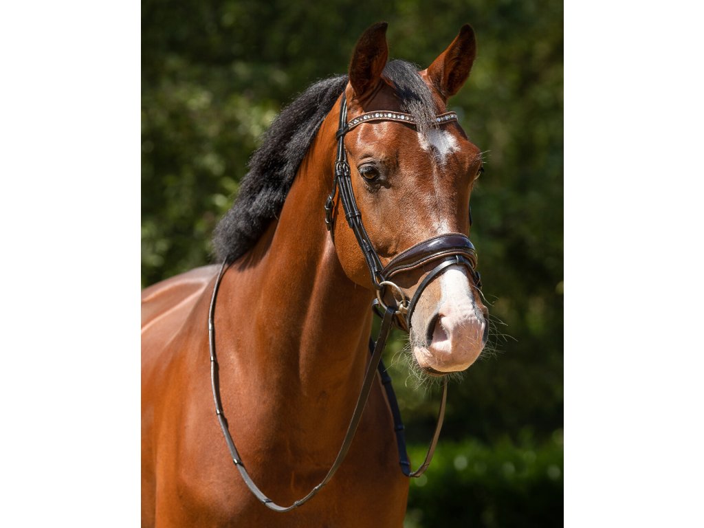 Wysokiej jakości ogłowie ze skóry, które jest doskonałym połączeniem elegancji i komfortu. Posiada anatomicznie ukształtowany nagłówek i nachrapnik w stylu szwedzkim, które są również miękko wyściełane dla maksymalnego komfortu. Falowany naczółek jest wyposażony w duże i małe cyrkonie, które pięknie się mienią. Ogłowie jest ozdobione lakierowanym nachrapnikiem, który jest wyściełany brokatem. Ogłowie jest dostarczane z wodzami i jest dostępne w trzech pięknych kolorach.