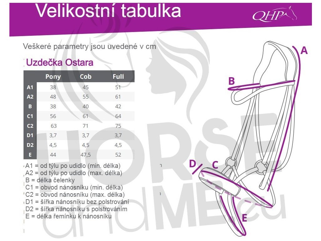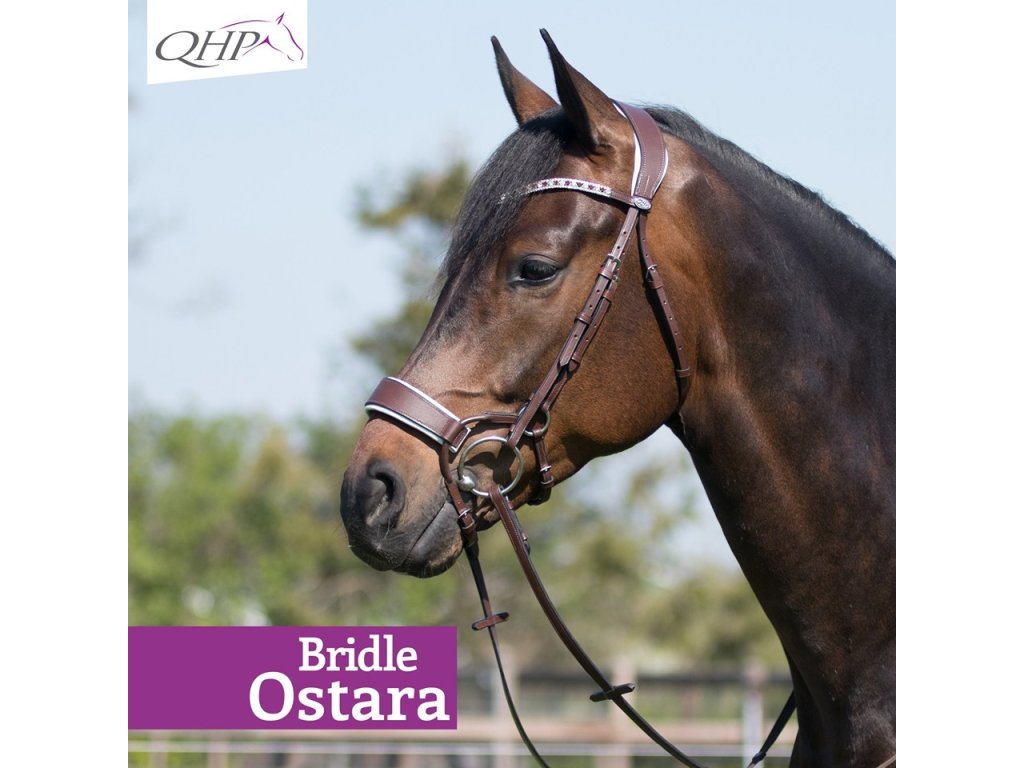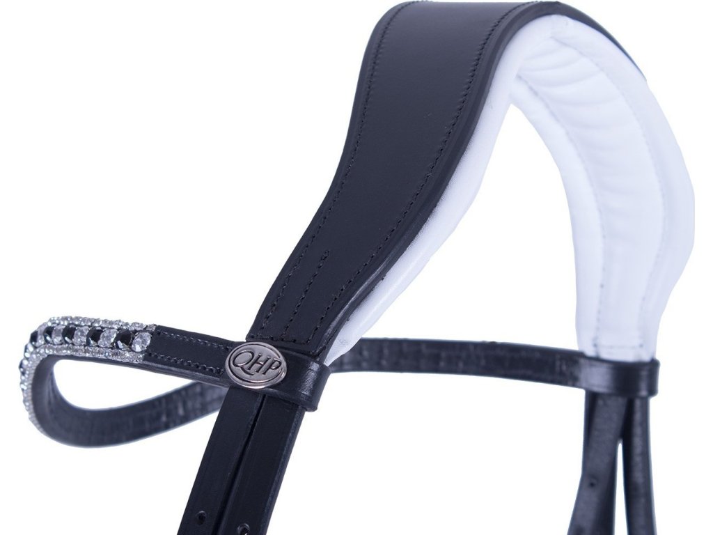 Specjalnie anatomicznie ukształtowane ogłowie QHP, które zapobiega naciskowi na wrażliwe obszary głowy konia. Posiada anatomicznie ukształtowany pasek potyliczny wyściełany miękkim żelem. Specjalnie ukształtowany nachrapnik zapewnia prawidłowe ułożenie i równomierny rozkład nacisku, a także jest miękko wyściełany żelem, z białym podszyciem. Ogłowie jest ozdobione pięknym, eleganckim naczółkiem ze srebrnymi i czarnymi cyrkoniami. W komplecie pasujące wodze. Dostępny również w kolorze brązowym.