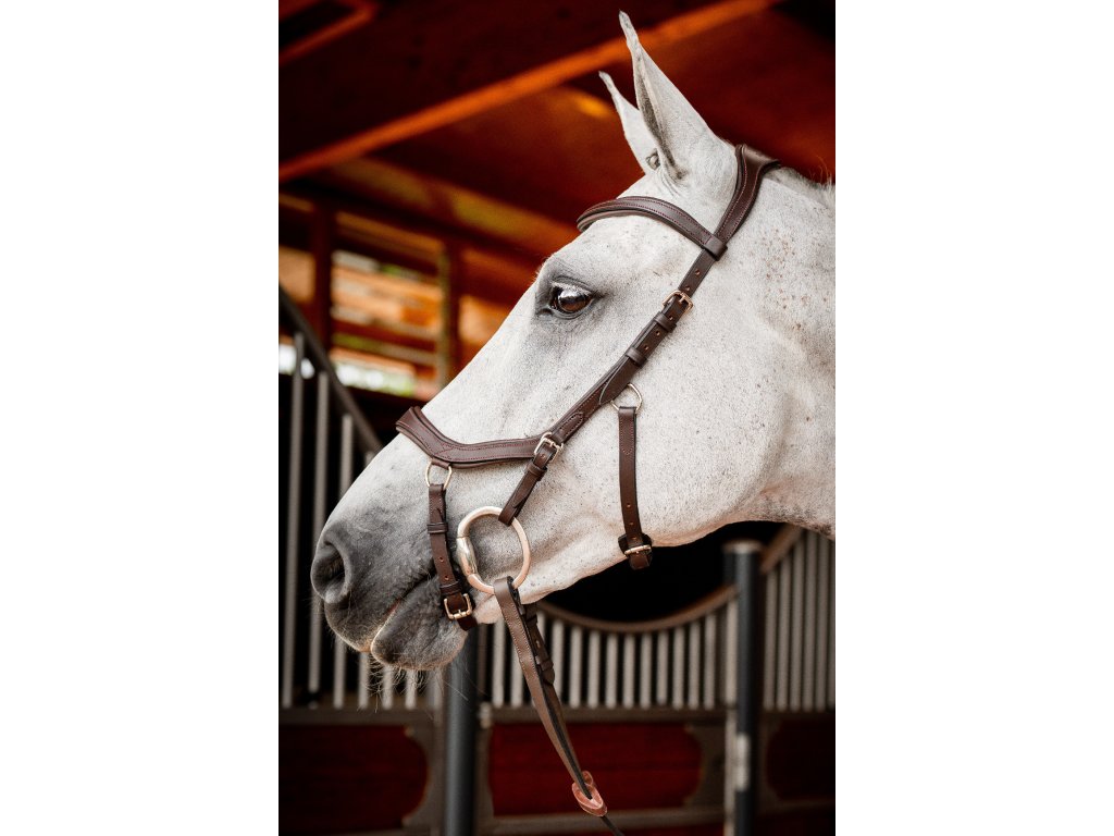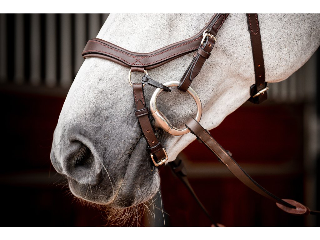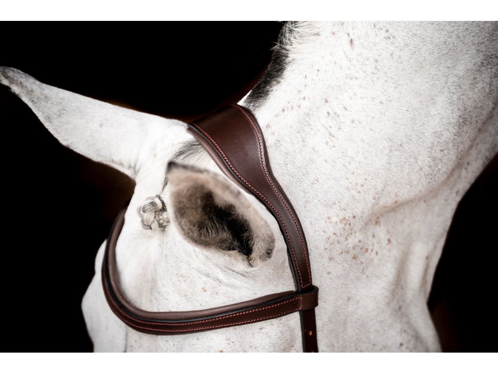 - Wyprofilowany i miękko wyściełany pasek potyliczny , równomiernie rozprowadzający nacisk dzięki swojej szerokości. Bez bezpośredniego połączenia z nachrapnikiem. Następnie pasek potyliczny zwęża się ku dołowi, aby zapobiec naciskowi na uszy.