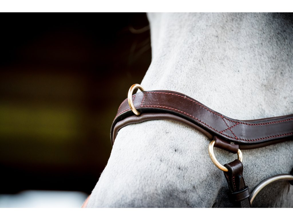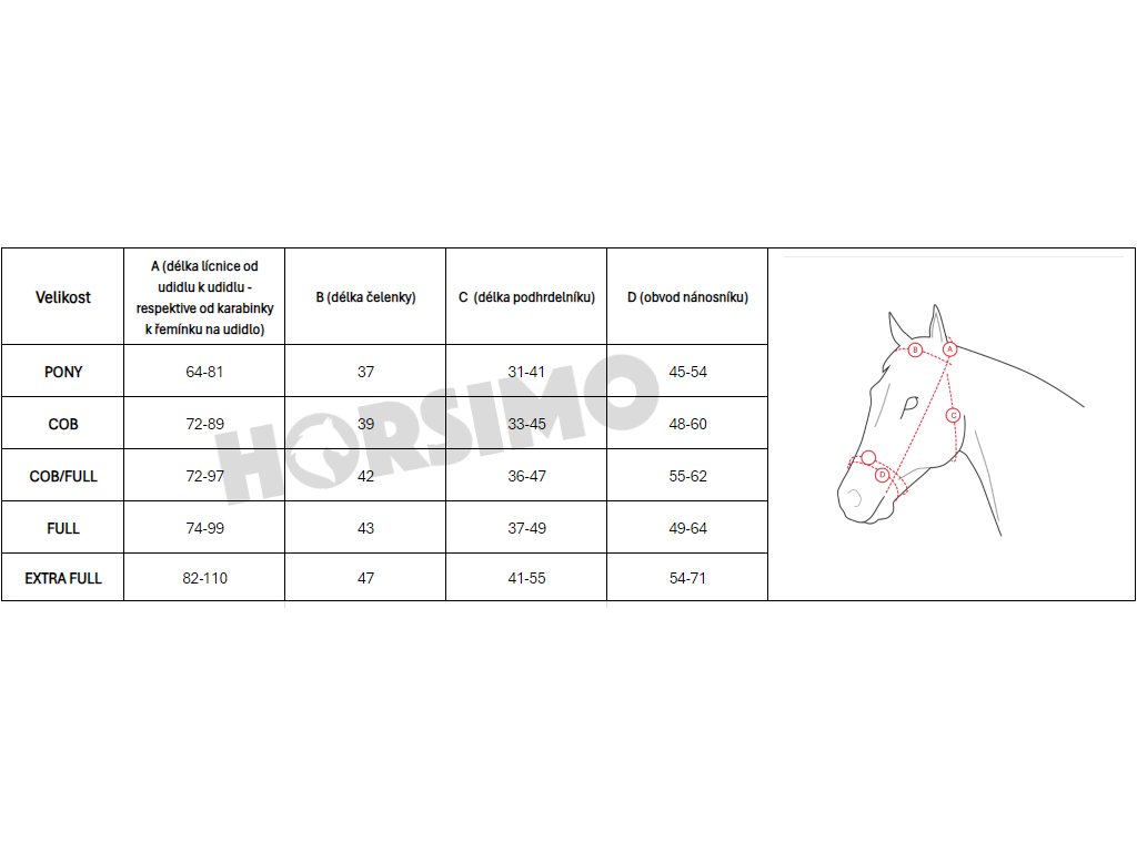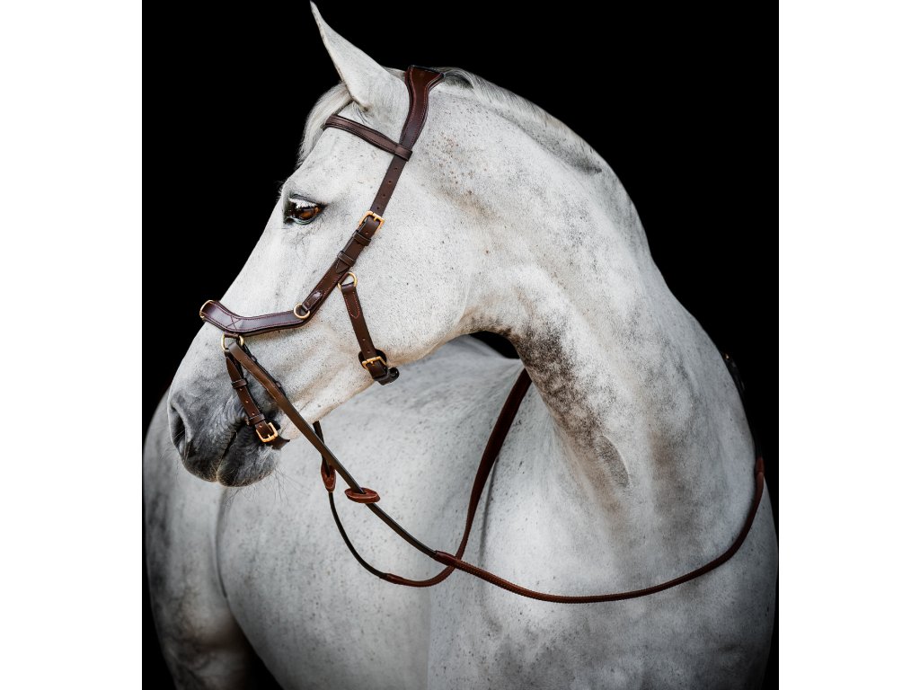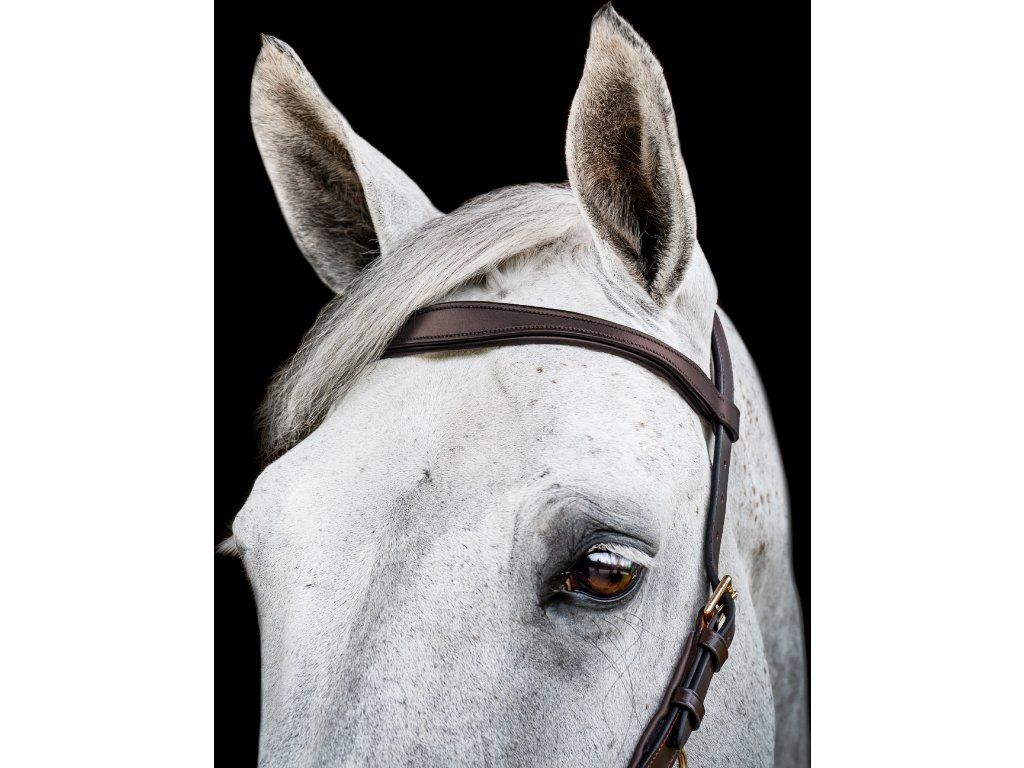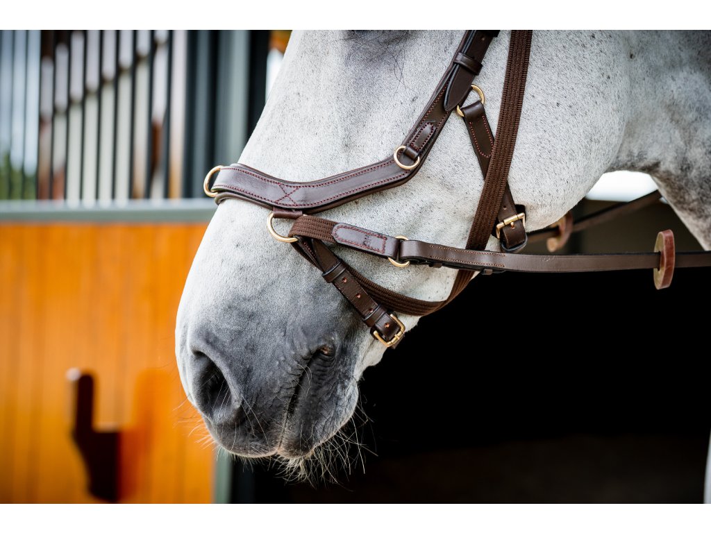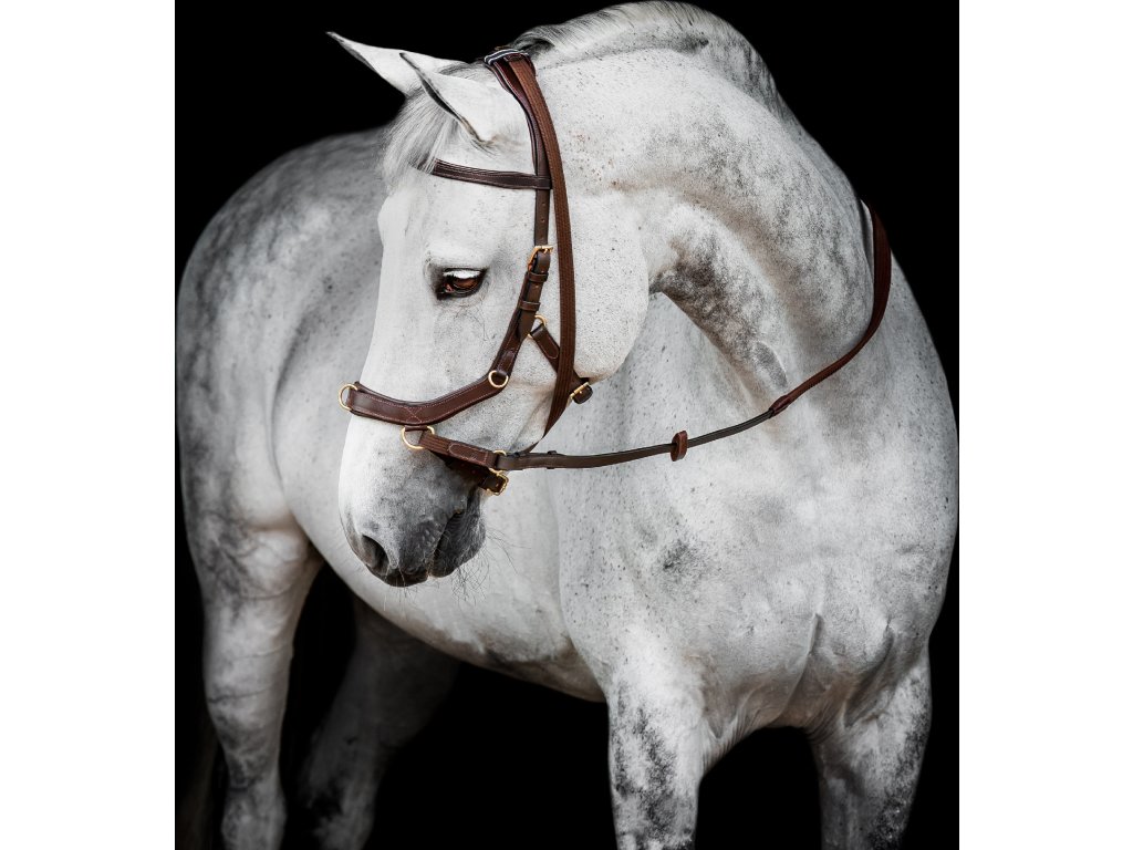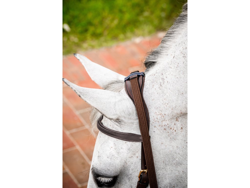 - Wyprofilowany i miękko wyściełany pasek potyliczny , równomiernie rozprowadzający nacisk dzięki swojej szerokości. Bez bezpośredniego połączenia z nachrapnikiem. Następnie pasek potyliczny zwęża się ku dołowi, aby zapobiec naciskowi na uszy.