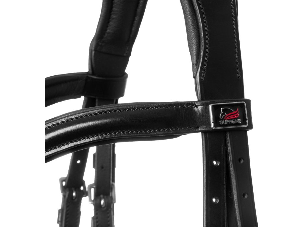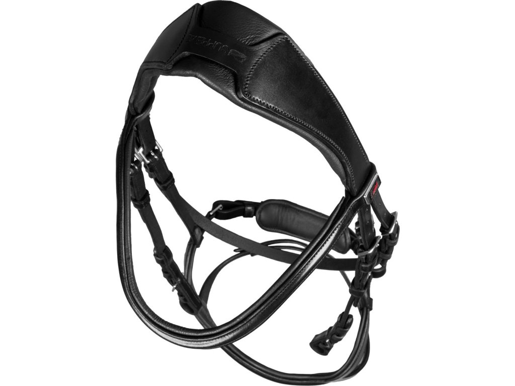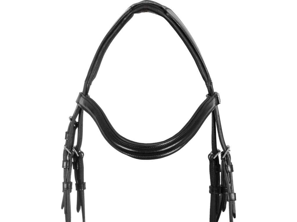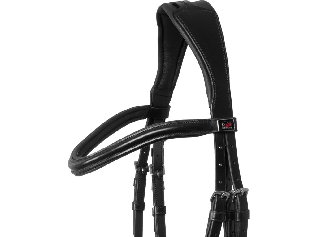 Anatomiczne ogłowie wykonane z miękkiej skóry. Wyposażone w klamry ze stali nierdzewnej, aby zapewnić trwałość i stabilność przez długi czas. Przód i naczółek ozdobione są przeszywanymi krawędziami w dopasowanym kolorze. Charakteryzuje się wyprofilowanym nachrapnikiem. Jest delikatnie wyściełane dla maksymalnego komfortu konia. Dostarczane w zestawie z wodzami. Dostępny w kolorze ciemnobrązowym i czarnym.