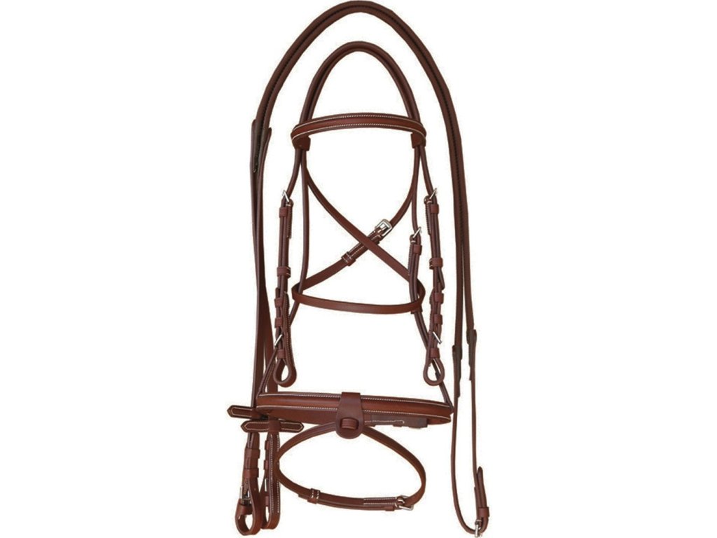 To ogłowie wykonane jest z wysokiej jakości skóry, co czyni je bardzo wytrzymałym. Wyposażone w połączony nachrapnik, pasek krzyżowy można łatwo odpiąć. Ogłowie wygląda bardzo elegancko, ozdobione jest białymi przeszyciami. Dostarczane z gumowymi wodzami. Dostępne w wielu kolorach. Dostępne w rozmiarach Shetland, Pony, Cob i Full.