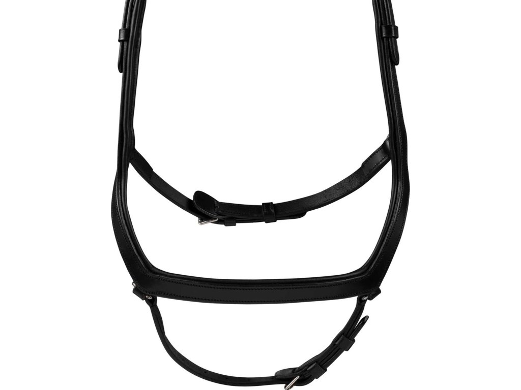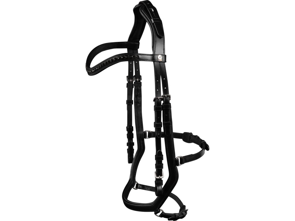 Wysokiej jakości anatomiczne ogłowie, które zapewnia spokojne ułożenie wędzidła. Krótki nachrapnik jest umieszczony na środku kości nosowej, aby zminimalizować nacisk na wrażliwe ścieżki nerwowe, naczynia krwionośne i obszary kostne na nosie i kościach policzkowych.Anatomiczny nagłówek zapewnia dużo miejsca na uszy i ma przerwę pośrodku, co zapobiega naciskowi na tył głowy. Nagłówek i nachrapnik są wyposażone w miękkie wyściółki. Okucia są w kolorze srebrnym i wykonane ze stali nierdzewnej. Naczółek ozdobiony subtelnymi dżetami. Zawiera wodze 19 mm.