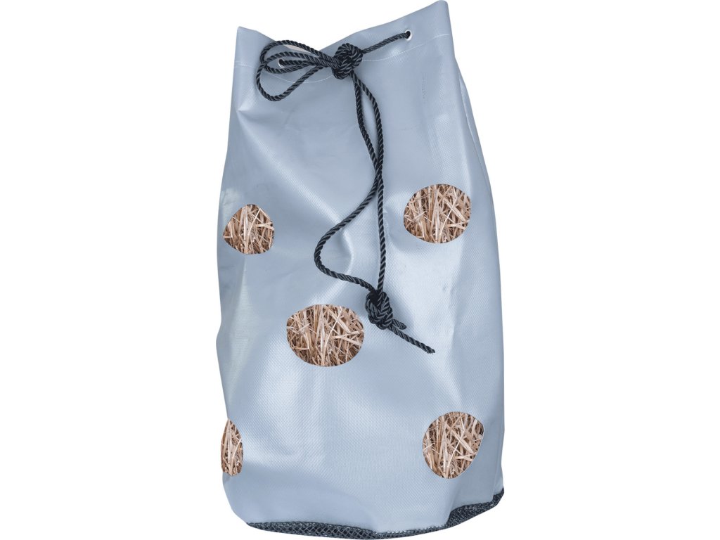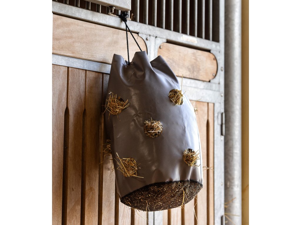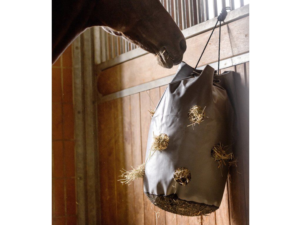 Ta torba na siano jest wykonana z mocnego materiału, który zapewnia długą żywotność i łatwą konserwację. Wygodnie napełnia się ją od góry i jest wyposażona w sznurek, który umożliwia łatwe zawieszenie. Torba posiada 12 otworów o średnicy około 8 cm, które wspomagają powolne i naturalne pobieranie pokarmu, przyczyniając się w ten sposób do zdrowego trawienia konia. Gładka powierzchnia materiału zapobiega również urazom pyska. Idealnie nadaje się do stosowania w stajni, na padoku i w podróży. Torba wydłuża czas karmienia, minimalizuje straty siana i ma pojemność 85 l, co odpowiada około 4 kg siana.