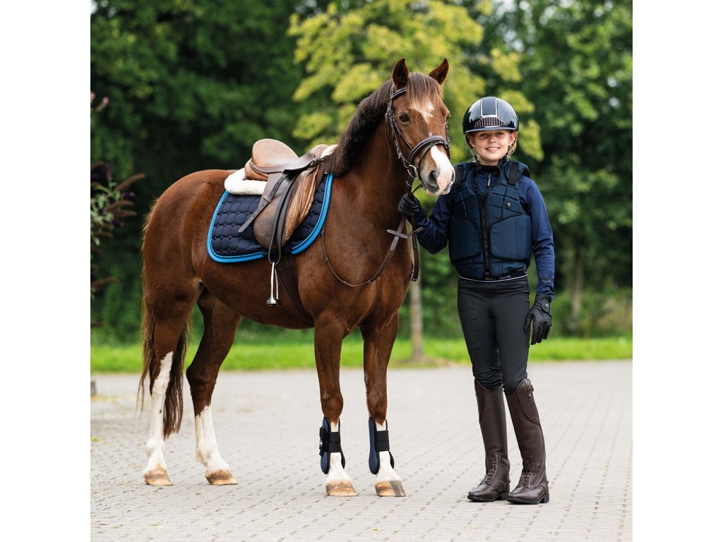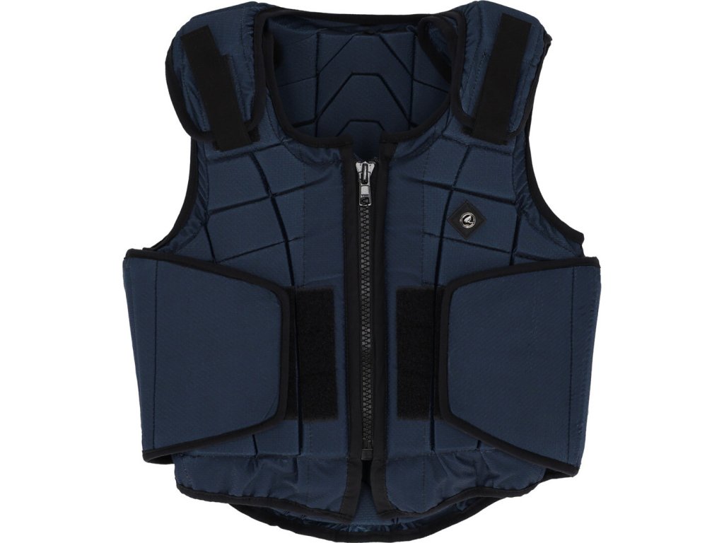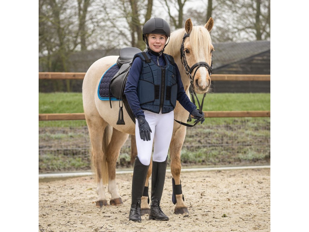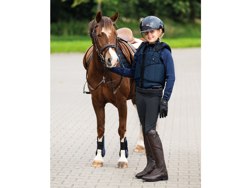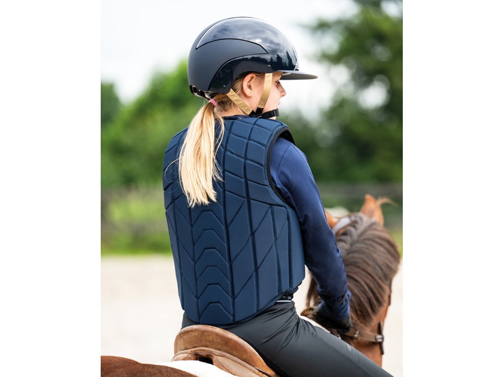 Kamizelka ochronna dla dzieci zapewniająca maksymalną ochronę podczas jazdy konnej. Skutecznie amortyzuje uderzenia w razie upadku, chroni przed urazami, a także zapewnia wysoki poziom komfortu. Dzięki zaawansowanemu systemowi strukturalnemu z profilowanymi, elastycznymi panelami z pianki, niezawodnie pochłania uderzenia i zapewnia doskonałe bezpieczeństwo podczas jazdy i treningu. Dzięki regulacji na rzepy po bokach, kamizelkę można łatwo i szybko dopasować do sylwetki, a przedni zamek błyskawiczny umożliwia szybkie zakładanie i zdejmowanie. Rozmiar można również regulować w okolicy ramion. Ważne jest, aby kamizelka była prawidłowo dopasowana i zapewniała pełną ochronę. Jeśli jest za mała, podczas zapinania na rzepach pojawi się czerwony wskaźnik, sygnalizujący problem. Jest zgodna z europejską normą EN-13158 oraz przetestowana i zatwierdzona na poziomie BETA 3.