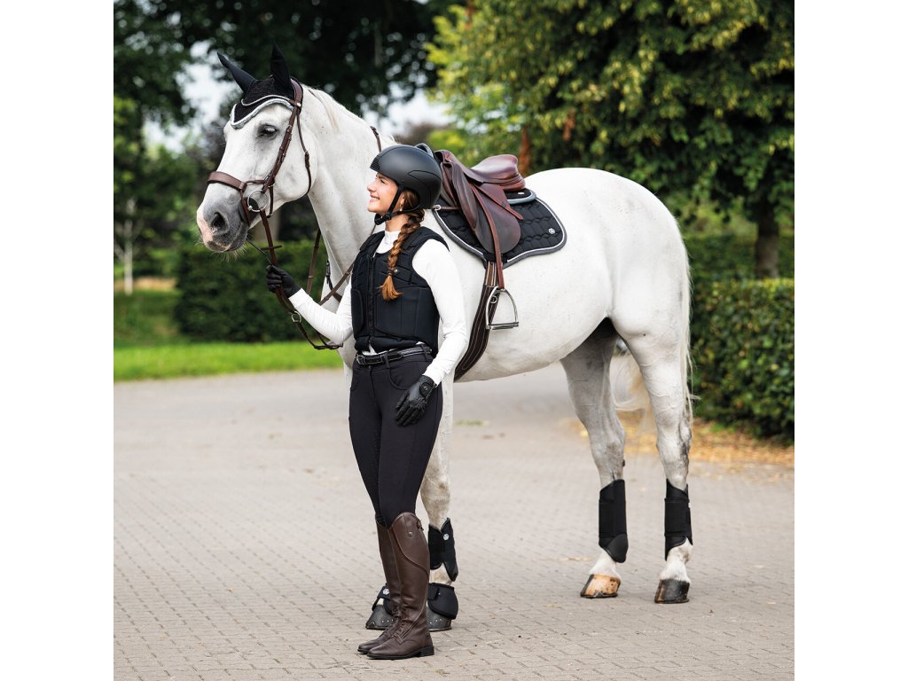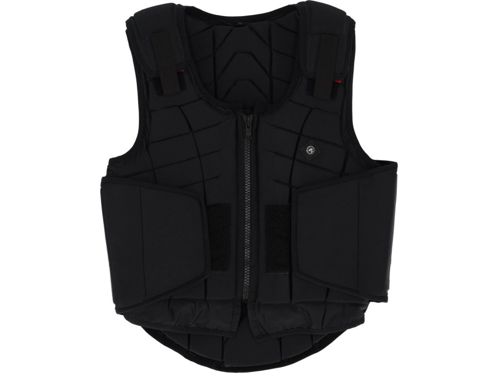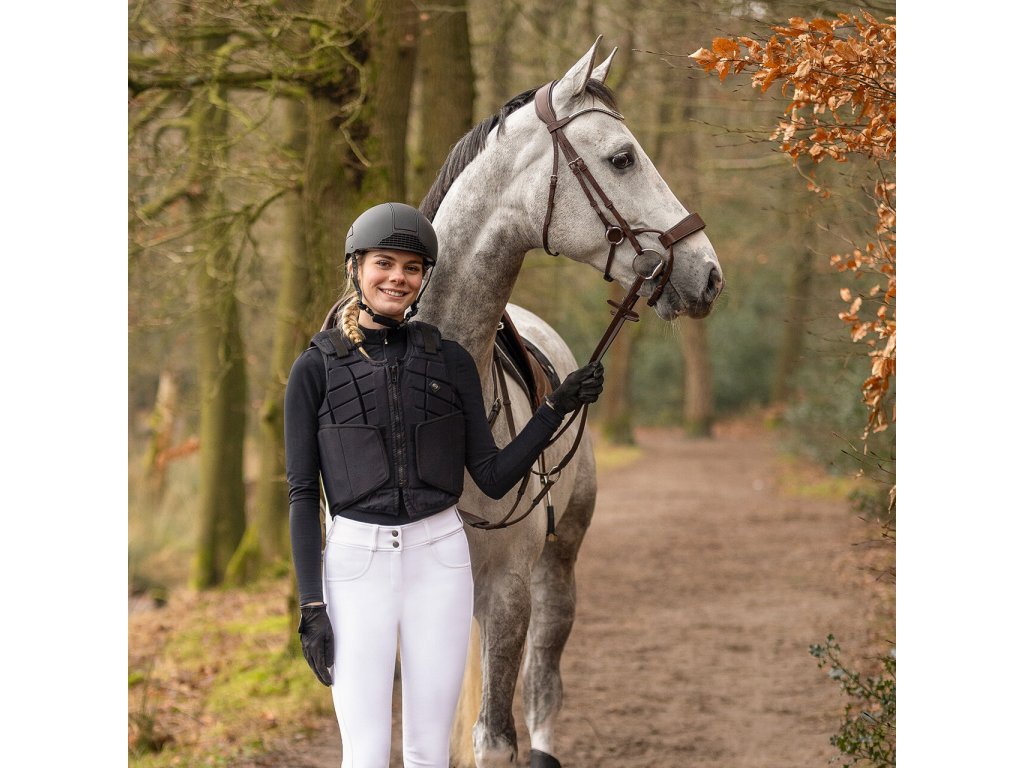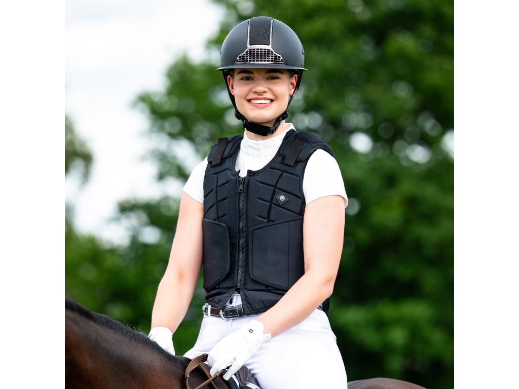 Kamizelka ochronna dla dorosłych zapewnia maksymalną ochronę podczas jazdy konnej. Skutecznie amortyzuje uderzenia w razie upadku, chroni przed urazami, a także zapewnia wysoki poziom komfortu. Dzięki zaawansowanemu systemowi strukturalnemu z profilowanymi, elastycznymi panelami z pianki, niezawodnie pochłania uderzenia i zapewnia doskonałe bezpieczeństwo podczas jazdy i treningu. Dzięki regulacji na rzepy po bokach, kamizelkę można łatwo i szybko dopasować do sylwetki, a przedni zamek błyskawiczny umożliwia szybkie zakładanie i zdejmowanie. Rozmiar można również regulować w okolicy ramion. Ważne jest, aby kamizelka była prawidłowo dopasowana i zapewniała pełną ochronę. Jeśli jest za mała, podczas zapinania na rzepach pojawi się czerwony wskaźnik, sygnalizujący problem. Jest zgodna z europejską normą EN-13158 oraz przetestowana i zatwierdzona na poziomie BETA 3.