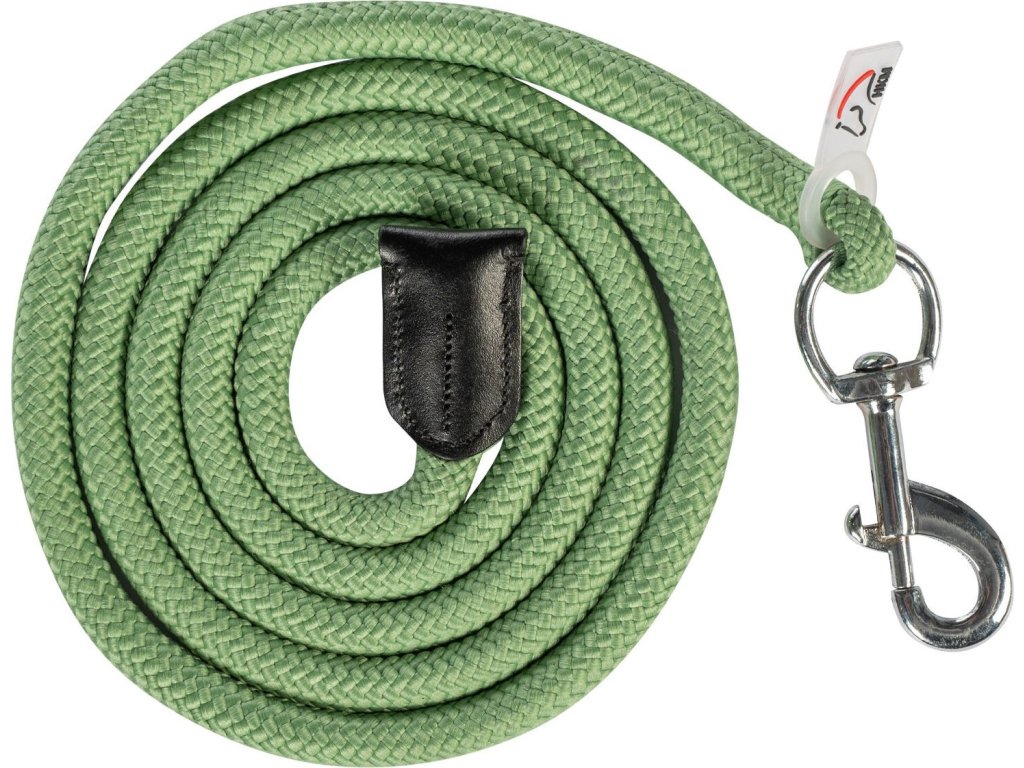 Uwiąz wyposażony w klasyczny karabińczyk w kolorze srebrnym. Wykończony skórzanym obszyciem. Idealnie pasujący kantar można kupić oddzielnie. Długość uwiązu wynosi 1,8 m. Dostępne w wielu kolorach.