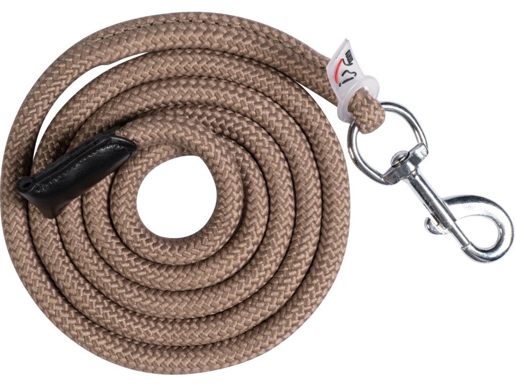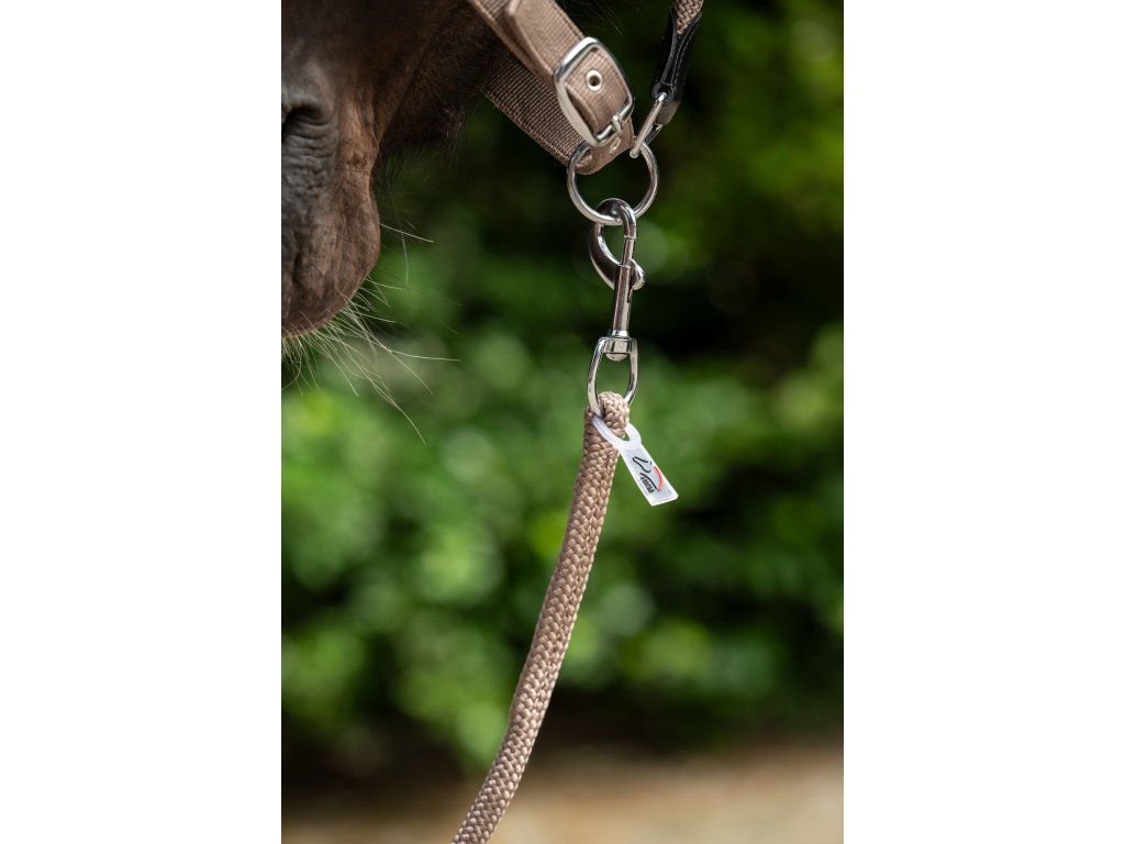 Uwiąz wyposażony w klasyczny karabińczyk w kolorze srebrnym. Wykończony skórzanym obszyciem. Idealnie pasujący kantar można kupić oddzielnie. Długość uwiązu wynosi 1,8 m. Dostępne w wielu kolorach.