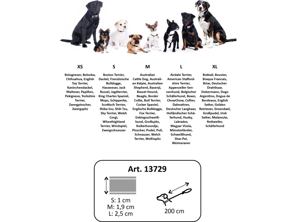 - szerokość smyczy: rozmiar S: 1 cm/ M: 1,9 cm/ L: 2,5 cm
