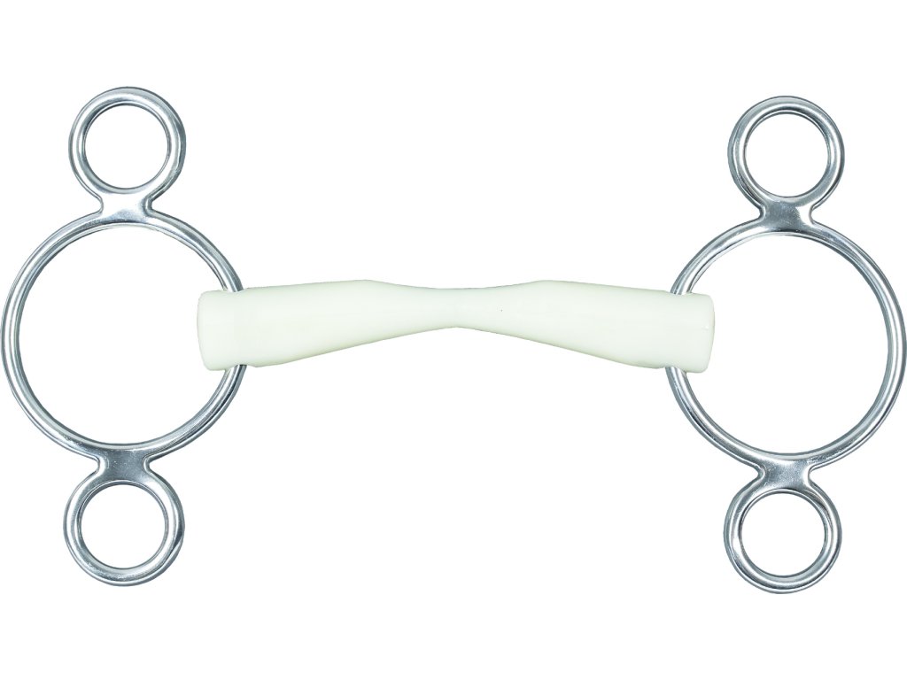 Wędzidło niełamane o konstrukcji pessoa, z trzema pierścieniami po każdej stronie. Wędzidło jest wzbogacone trwałym jabłkowym smakiem, który pobudza żucie. Z gładką plastikową powierzchnią i pierścieniami ze stali nierdzewnej. Grubość: 20 mm, średnica pierścieni: 6, 5 cm.