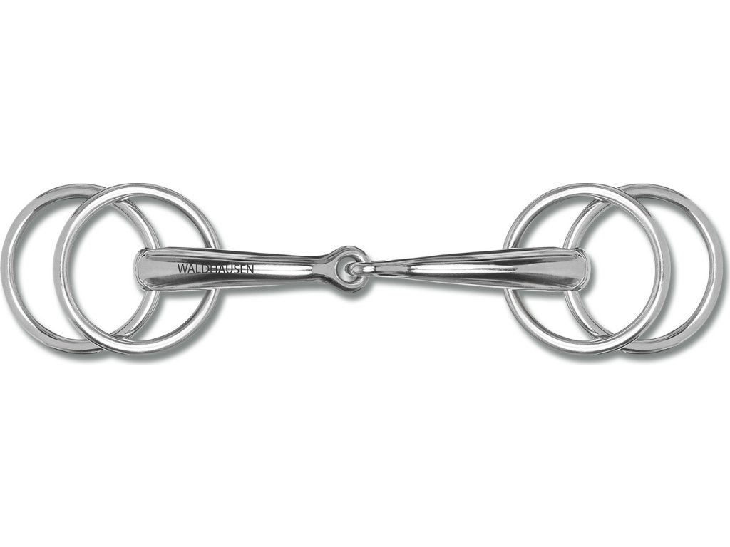 Wędzidło pojedynczo łamane wykonane z solidnej stali nierdzewnej. Specjalne z czterema pierścieniami. Grubość: 16 mm, pierścienie: Ø 5 cm.