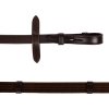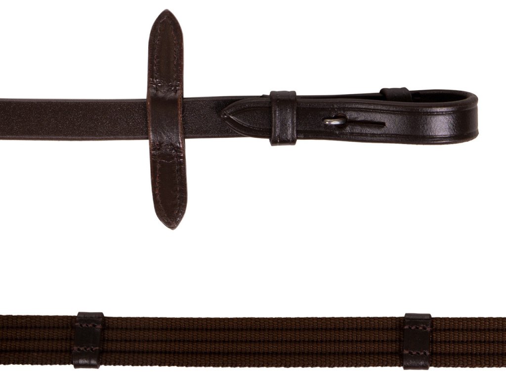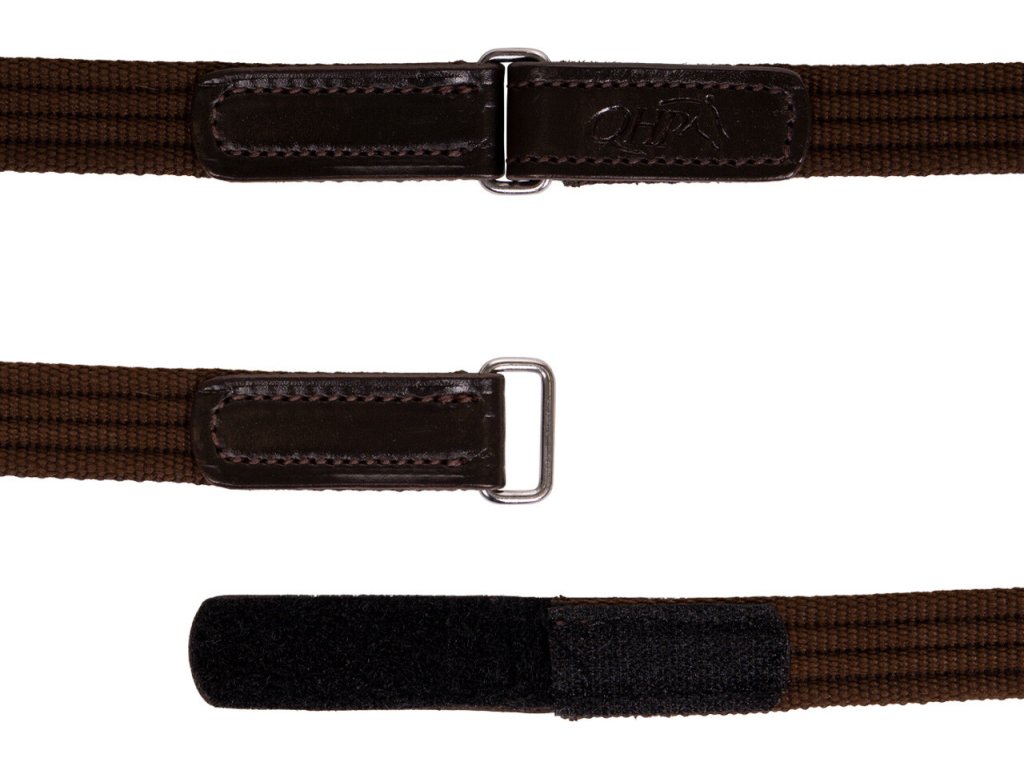 Wysokiej jakości wodze wykonane z połączenia materiałów – skóry i bawełny. Wyposażone są w skórzane ograniczniki, uchwyty do wytou i klamry, które ułatwiają przymocowanie do wędzidła. Wodze są połączone metalową klamrą i zabezpieczone rzepem. Dzięki temu wodze można łatwo odłączyć i ponownie przymocować.