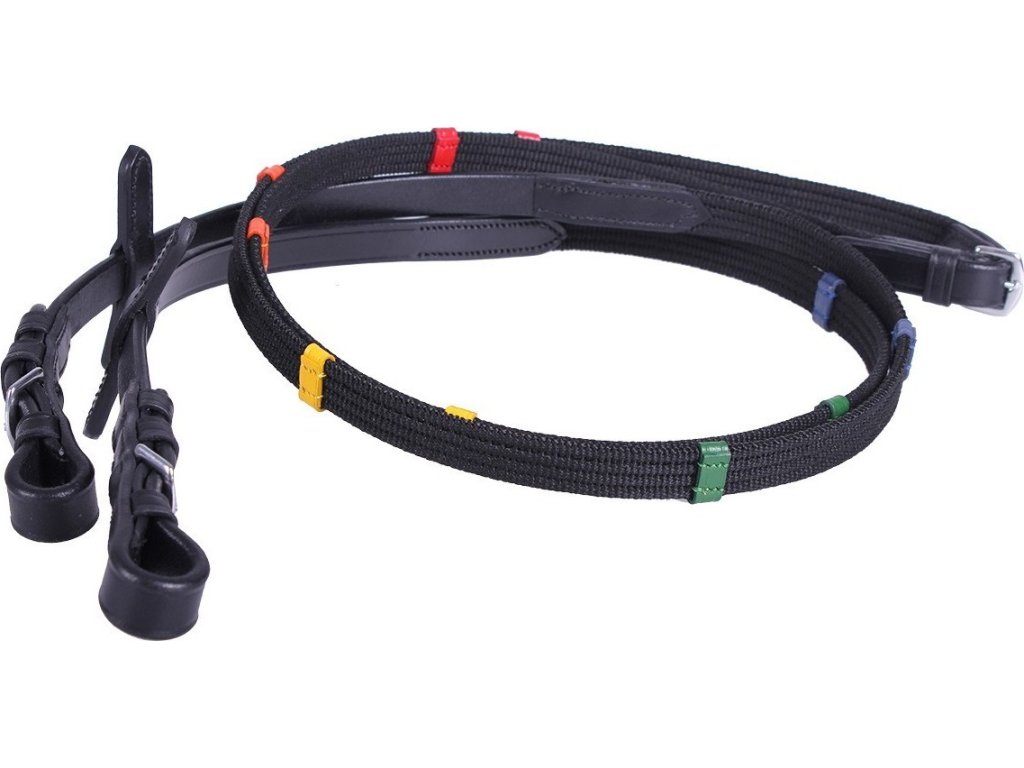 Unikalne wodze z kolorowymi stoperami, które dodają im charakteru. Wykonane z połączenia skóry i bawełny. Kolorowe stopery są również idealną pomocą dla dzieci uczących się jeździć konno.