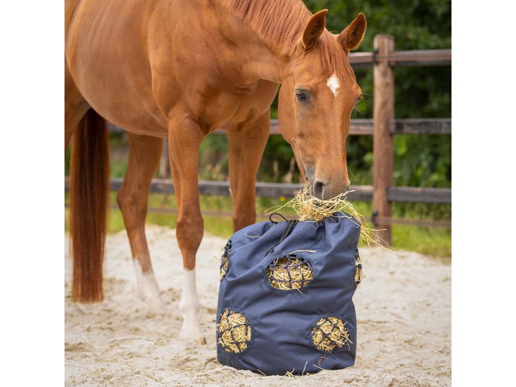 Wysokiej jakości torba na siano wykonana z wodoodpornego i wytrzymałego materiału. Torba jest napełniana od góry i wyposażona w sznurek ułatwiający zawieszenie. Wielkość oczek siatki wynosi 15 cm. Torba nadaje się np. do boksu, na padok lub w podróży. Wydłuża czas karmienia i zapobiega marnowaniu siana. Pojemność: 43 l.